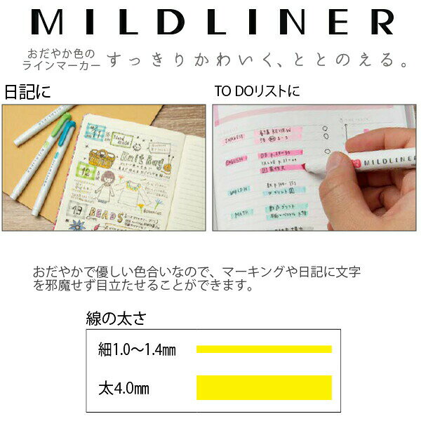 ゼブラ ラインマーカー マイルドライナー 晴れやかマイルド色 5色セット 太・細両用 (太:4mm 細:1.0mmから1.4mm)水性顔料 WKT7-5C-HC-N HC5色セットサイズ 本体サイズ:全長:141.5×最大軸径11.5mm 10.1gパッケージサイズ:縦210×横94.0×厚み16.0mm 53.0g仕様太細両用(水性顔料)線幅太:4.0mm細:1.0から1.4mm入数5本セット内容晴れやかマイルド5色マイルドフューシャ・マイルドマリーゴールド・マイルドシトラスグリーン・マイルドサマーグリーン・マイルドラベンダー特徴かわいい晴れやかマイルド色 5色セット 太・細両用ラインマーカーおだやかな色合いなので、マーキングしても色が邪魔をせず文字が読みやすいです。色のトーンがそろっているので、どの色の組み合わせでもまとまり感が出ます。スケジュールのタスク管理に色を添えたり、自分好みにかわいくお使いになることができます。感熱紙に使用しても筆記線の変色が少なく、感圧紙でも文字を隠ぺいしません。1本で太・細書きできるツインタイプのラインマーカー5色セットです。こちらの商品は同一商品5個までをゆうパケット1個口分の送料に設定しています。