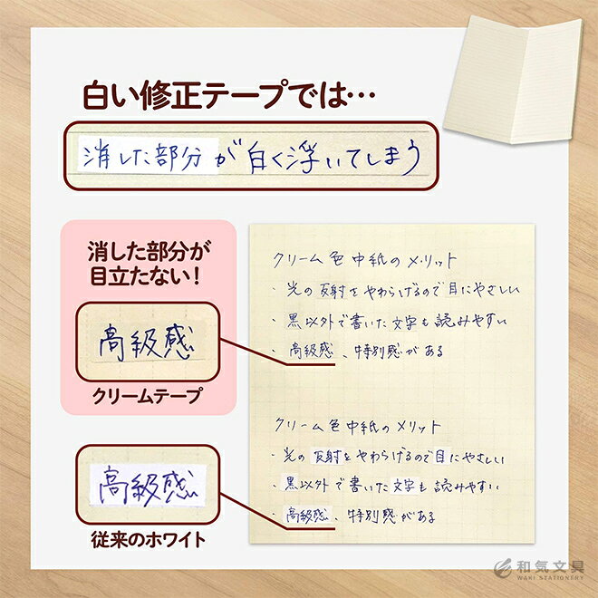 仕様商品名プラス PLUS 修正テープ ホワイパープチ クリームテープサイズ・外形寸法:W58×D15×H26mm素材・PS・ABS・POM仕様・テーフ゜の長さ:6m・バリエーション・ブラウン 2.5mm・レッド 4mm・ブルー 5mm・グリーン 6mm商品説明手帳やノートに多く使われている淡いクリーム色用紙用の修正テープです。6mのテープを搭載しながら消しゴム並みのプチサイズで、携帯に便利。JSダイアリーにもおすすめです。備考※パッケージや仕様はメーカー要因により予告なく変更になる場合がございます。お中元、お歳暮、母の日、父の日、敬老の日、ブライダル、誕生日、記念日、恩師・上司へのギフトに文房具が喜ばれます。また、結婚内祝い、出産内祝い、合格祝い、就職祝い、卒業祝い、入園・入学祝い、昇進祝い、還暦祝いなどのお祝いのプレゼントや、販売促進の景品やギフトにも。デザイン文具やオフィス文具、学校で使える文房具、事務用品などの様々なステーショナリーのアウトレットや訳ありセール商品もご用意。商品への名入れやラッピングも行っています。文房具なら和気文具(ワキ文具)[tag:プラス][tag:修正テープ]手帳やノートに多く使われている淡いクリーム色用紙用の修正テープです。隠ぺい力は従来の修正テープと同等のまま、白色層の厚みを当社従来品に比べて11%減らすことで、紙面との段差を少なくしたテープを採用。ペン先で削れにくく、さらさらときれいに上書きできるので、再筆記時にテープが削れたり、はがれたりするお悩みを解消します。手帳やノートのブランドによって微妙に異なる用紙の色合いを研究し、幅広く対応できるよう調色された修正テープなので仕上がりにこだわる手帳ユーザーにおすすめです。「ココだけ消したい」。そんな時には本体を反転させて、文字を見ながら修正できる“リバースモード”で、消したい文字だけをピンポイントで修正できます。自分にぴったりのサイズを選べる4種類のテープ幅「極細」「細幅」「標準」「太幅」の4種類のテープ幅をラインアップ。愛用の手帳・ノートの罫線の幅や書く文字の大きさに合わせて選べます。「極細」2.5mm幅なら、文字の一部分だけのピンポイント消しに最適 です。パッケージ→翌日配送をご利用の際は必ずこちらのページをご確認ください。ジャンプ位置615
