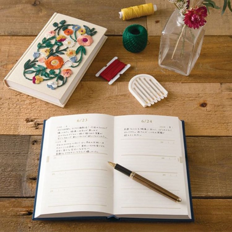 仕様商品名ミドリ midori 5年連用日記 刺繍 花柄サイズ・H185×W117×D28mm素材・表紙/布製 刺繍付 金箔押し(背)・カバー/PVC製・製本/糸かがり綴じ しおりひも付・本文/MD用紙仕様・本文/366ページ(5年分) 罫幅6mm・付録/3ページ(「年の初めに想うこと」「年の終わりに想うこと」「パーソナルメモ」)バリエーション・ベージュ・黒商品説明日々の出来事を言葉にして紡いでいく連用日記。同じ日の記録を5年分一覧でき、去年の今日を振り返りながら読む楽しみ、書く楽しみを一度に味わうことができます。忘れていたできごとに思いがけず「再会」できる、時間と共に増していく、愛着を愉しむ5年連用日記です。あたたかみのある刺繍は、糸の太さやシルエットの形にこだわり、立体感が出るようにデザインされています。備考※パッケージや仕様はメーカー要因により予告なく変更になる場合がございます。刺繍がかわいい連用日記・ダイゴー 花ことば日記 3年連用 B6 ¥2,640お中元、お歳暮、母の日、父の日、敬老の日、ブライダル、誕生日、記念日、恩師・上司へのギフトに文房具が喜ばれます。また、結婚内祝い、出産内祝い、合格祝い、就職祝い、卒業祝い、入園・入学祝い、昇進祝い、還暦祝いなどのお祝いのプレゼントや、販売促進の景品やギフトにも。デザイン文具やオフィス文具、学校で使える文房具、事務用品などの様々なステーショナリーのアウトレットや訳ありセール商品もご用意。商品への名入れやラッピングも行っています。文房具なら和気文具(ワキ文具)[tag:日記帳][tag:ミドリ]カラフルで立体的な花刺繍が目を引く、上質な5年連用日記。にじみや裏抜けがしにくい「MD用紙」を使用。開きやすくて丈夫にするための「糸がかり綴じ」で製本しています。月の初めには、記念日などを記録する事ができます。巻頭にはプロローグ、巻末にはエピローグが付いているので、その年々の初めと終わりに思い出を記録する事ができますよ。立体的な刺繍が他の日記にはない上質感があり、花の刺繍1つ1つにこだわりを感じますね♪ラッピングはタイプがふたつあります。→翌日配送をご利用の際は必ずこちらのページをご確認ください。刺繍がかわいい連用日記ダイゴー 花ことば日記 3年連用 B62,640 円本文にも花のイラストが散りばめられています。花ことばとデザインは花のプロ、日比谷花壇の監修です。この商品は1点までメール便可