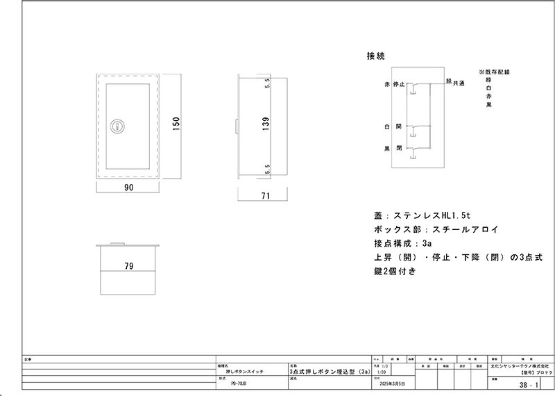 商品説明メーカー名 文化シヤッター株式会社製 材質ステンレス蓋商品説明シャッター3点式押しボタンスイッチになります。軽いタッチでの操作が可能です。部屋の中と外など、後からスイッチを増設したい場合などにご利用ください。 ※ご購入の際の注意点※ 押し釦交換の際、文化シヤッター以外の場合は下記の点にご注意ください。 商品ページに掲載している配線図は、文化シヤッター製のもので接点構成は、3aになります。 今お使いの押し釦に掲載されている接点構成をご確認いただき、ご注文の際はご注意ください。 接点構成が同じものでも、配線の色分けは違う場合があります。 文化シヤッター製は下記の配線色になっております。 コモン 緑 上昇 白 停止 赤 下降 黒 他メーカーで同じように配線しても、配線色があっていない場合がありますので、 現在ご使用のボタンの配線色を確認して工事を行ってください。(※工事は有資格者で行ってください。)3点式押しボタンスイッチステンレス蓋接点3a埋込型【PB-70UB】 シャッター3点式押しボタンスイッチになります。軽いタッチでの操作が可能です。部屋の中と外など、後からスイッチを増設したい場合などにご利用ください。 ※ご購入の際の注意点※ 押し釦交換の際、文化シヤッター以外の場合は下記の点にご注意ください。 商品ページに掲載している配線図は、文化シヤッター製のもので接点構成は、3aになります。 今お使いの押し釦に掲載されている接点構成をご確認いただき、ご注文の際はご注意ください。 接点構成が同じものでも、配線の色分けは違う場合があります。 文化シヤッター製は下記の配線色になっております。 コモン 緑 上昇 白 停止 赤 下降 黒 他メーカーで同じように配線しても、配線色があっていない場合がありますので、 現在ご使用のボタンの配線色を確認して工事を行ってください。(※工事は有資格者で行ってください。)