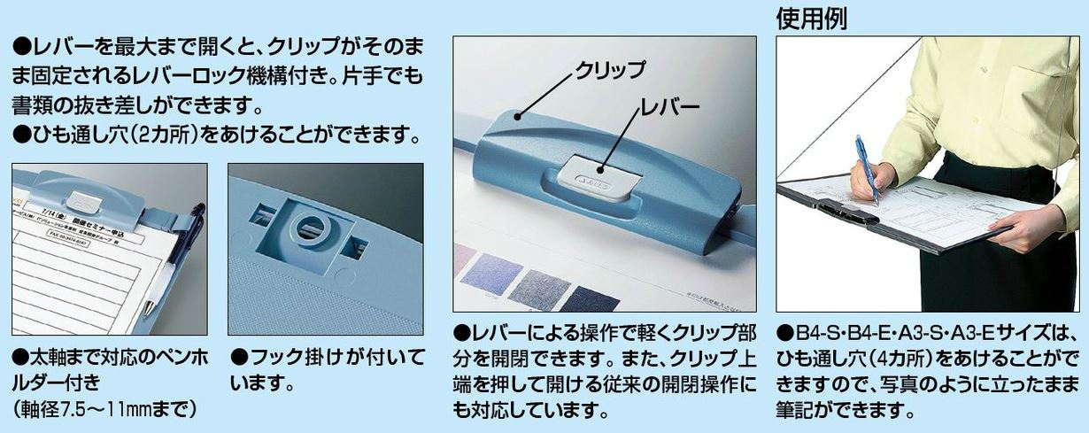 ●サイズ:A4-E ●ヨコ・タテ:236・325 ●再生材配合率:本体/R-ABS100%・ペンホルダー/R-EVA100% ●材質:本体/R-ABS メーカー希望小売価格はメーカーカタログに基づいて掲載しています●レバーによる操作で軽くクリップ部分を開閉でき、クリップ上端を押して開ける従来の開閉操作にも対応しています。 ●レバーを最大まで開くと、クリップがそのまま固定されるレバーロック機構付き。片手でも書類の抜き差しができます。 ●ひも通し穴(2カ所)をあけることができます。 ●太軸まで対応のペンホルダー付き(軸径7.5〜11mmまで) ●フック掛けが付いています。 ●材質/本体R-ABS。 ●外寸法/236・325。 ●ユニバーサルデザイン ヨハ-H78B,ヨハ-H78DM,ヨハ-H78G,ヨハ-H78P