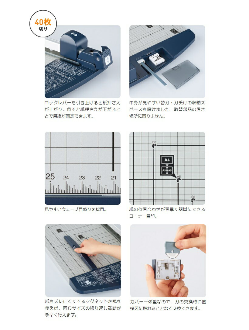 ●サイズ:A3 ●外寸法(W・D・H):355・654・93 ●裁断幅:428mm ●最大メモリ(横幅):320mm ●替刃(丸刃・ミシン目刃(別売)):DN-TR01A,DN-TR01B ●刃受け:DN-600C ●質量:3.2kg ●裁断能力(約2往復裁断)/PPC用紙40枚 ●材質/金属部:鋼板・アルミ、樹脂部:ABS・POM ●付属品/マグネット定規・丸刃1個(本体セット済み)・刃受け2枚(うち1枚は本体セット済み) ●ミシン目刃(別売)は、PPC用紙3枚以下でご使用ください。 メーカー希望小売価格はメーカーカタログに基づいて掲載しています●チタン加工刃搭載のペーパーカッター40枚裁断タイプがスタイリッシュにリニューアル! ●チタン加工刃搭載で、切れ味持続2倍・切れ味110%・刃先の硬度2.5倍(すべてコクヨ比。チタン加工あり・なしの場合で比較) ●スライダーを前後にスライドするだけで、簡単に裁断ができるロータリー式ペーパーカッター(裁断能力:PPC用紙40枚) ●コーナー目印つきなので、半分カットも定型カットも手早く位置合わせできます。 ●盤面の目盛りは見やすいウェーブ目盛りを採用。 ●付属のマグネット定規を使えば、同じサイズのくり返しカットが手早くおこなえます。 ●丈夫な金属盤面採用 ●持ち上げやすい持ち手つき ●本体に替刃・刃受けの収納ケースをがあり、取替部品の置き場所に困りません。 ●刃は、丸刃とミシン目刃(別売)が使用でき、用途に応じて使い分けができます。 <関連商品> DN-TR403 (A4/小さいサイズ) DN-TR01A (替刃(丸刃・チタン加工)) DN-TR01B (替刃(ミシン目刃・チタン加工)) DN-600C (刃受け)