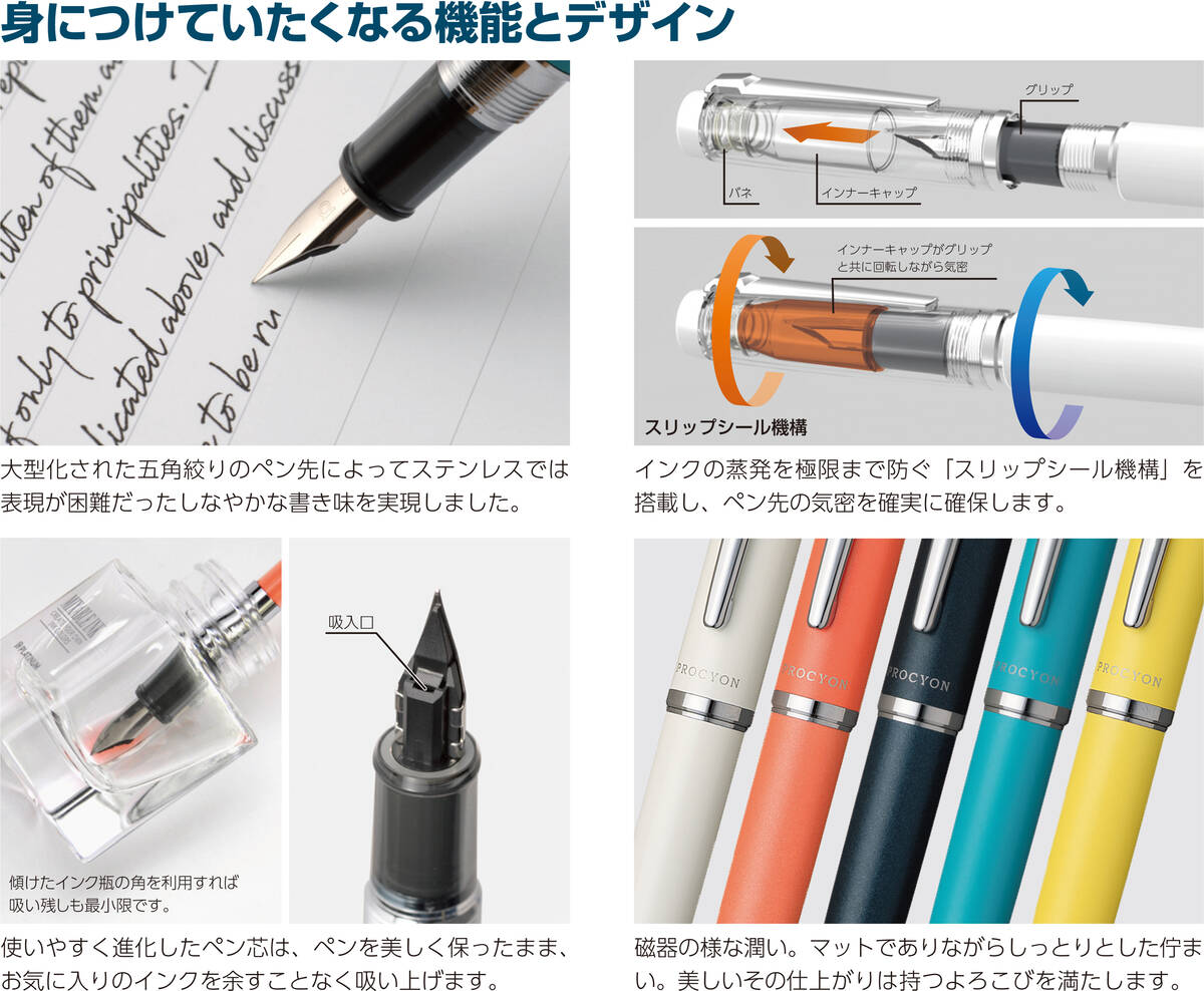 ●ペン先:ステンレスペン ●仕様:アルミボディ、マット塗装仕上げ。 ●サイズ:全長139.7mm、最大径14.4mm ●標準重量:23.3g ●付属品:カートリッジインク(ブルーブラック) ●スリップシール機構搭載。 シャドウマイカ/PNS5000#1-2(PNS5000#1-F),PNS5000#1-3(PNS5000#1-M),カーマインレッド/PNS5000#10-2(PNS5000#10-F),PNS5000#10-3(PNS5000#10-M),パーシモンオレンジ/PNS-5000#25-2(PNS-5000#25-F),PNS-5000#25-3(PNS-5000#25-M),ディープシー/PNS-5000#50-2(PNS-5000#50-F),PNS-5000#50-3(PNS-5000#50-M),ターコイズブルー/PNS-5000#52-2(PNS-5000#52-F),PNS-5000#52-3(PNS-5000#52-M),シトロンイエロー/PNS5000#68-2(PNS5000#68-F),PNS5000#68-3(PNS5000#68-M),ポーセリンホワイト/PNS-5000#3-2(PNS-5000#3-F),PNS-5000#3-3(PNS-5000#3-M)●「プロシオン」の名は、全天に21個ある一等星の一つ、こいぬ座の恒星「プロキオン」に由来。ビジネスシーンや生活シーンでのアクセントとしてきらりと輝く万年筆をコンセプトに、また、新しい万年筆の可能性に挑戦する道標として名付けられました。 ●いつでもさらりと書き出せる「スリップシール機構」を搭載。スクリュー式のキャップと合わせてインクの蒸発を極限まで防ぎます。 ●五角絞りのペン先は「書くよろこび」を刺激し、肌に馴染む特殊塗装と鮮やかなカラー展開は「持つよろこび」を刺激します。