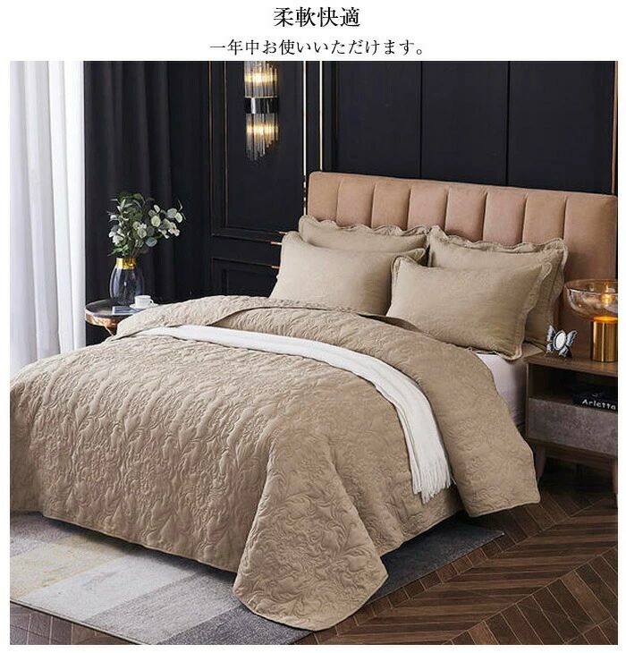 キーワードベッドカバー 単品 キルティング ベッドカバー マルチカバー ベッドキルト ベッドスプレッド ブランケット ソファーカバー おしゃれ 高級カバー 送料無料素材コットンポリエステルサイズベッドカバー(1点):240×250cm枕カバー:48×74cm商品説明上品で優しい。肌触りも非常に良くて、一年中お使いいただけます。エレガントでモダンな雰囲気の中に柔らかさ、優しさをプラス。寝室がいつも以上にリラックスできる空間になりそう。ベッドスプレッドやこたつカバー、ソファカバーなど、一年中活躍できるマルチカバーです。糸を使わない超音波キルト加工を施していますので、糸切れの心配がありません。汚れてもサッと取り外して洗濯機で丸洗いができるので衛生的。洗濯表示30℃以下の水温で洗濯機の弱水流もしくは弱い手洗いができます。(洗濯ネット使用)干し方=日陰のつり干しがよい。キーワードベッドカバー 単品 キルティング ベッドカバー マルチカバー ベッドキルト ベッドスプレッド ブランケット ソファーカバー おしゃれ 高級カバー 送料無料素材コットンポリエステルサイズベッドカバー(1点):240×250cm枕カバー:48×74cm商品説明上品で優しい。肌触りも非常に良くて、一年中お使いいただけます。エレガントでモダンな雰囲気の中に柔らかさ、優しさをプラス。寝室がいつも以上にリラックスできる空間になりそう。ベッドスプレッドやこたつカバー、ソファカバーなど、一年中活躍できるマルチカバーです。糸を使わない超音波キルト加工を施していますので、糸切れの心配がありません。汚れてもサッと取り外して洗濯機で丸洗いができるので衛生的。洗濯表示30℃以下の水温で洗濯機の弱水流もしくは弱い手洗いができます。(洗濯ネット使用)干し方=日陰のつり干しがよい。