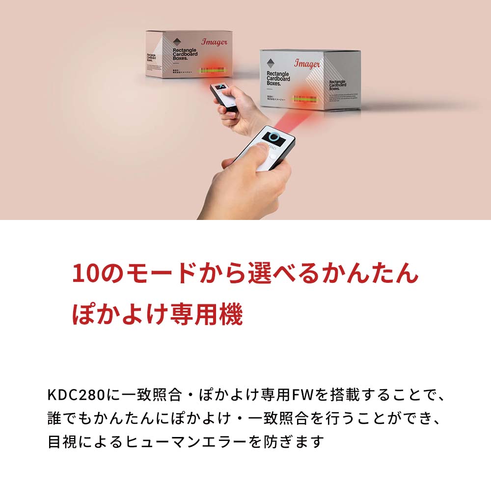 (※)FastDelivery商品は、本社保管商品を社員が直接出荷作業を行う即納商品です。 ポカヨケ専用 KDC280-PY5|ポカよけ・モデル 人間の目から機械の目へ!誰でも簡単に、ぽかよけ・一致照合を行うことができ、 目視によるヒューマンエラーを防ぎます。 ※本品はKDC280-PY5であり、KDC280-PYの後継機種です。 変更点は本体USBポート規格(microUSB > USB-C)となり、機能的な変更はございません。 ※本品は、バーコード、QRコードに対応しています。OCR文字読み取りによる一致照合をご希望の場合は 「ポカよけ for Android」をご検討下さい。 ・注意点:モニターの発色具合によって実際のものと色が異なる場合があります。 仕様ポカヨケ専用 KDC280-PY5|ポカよけ・モデル