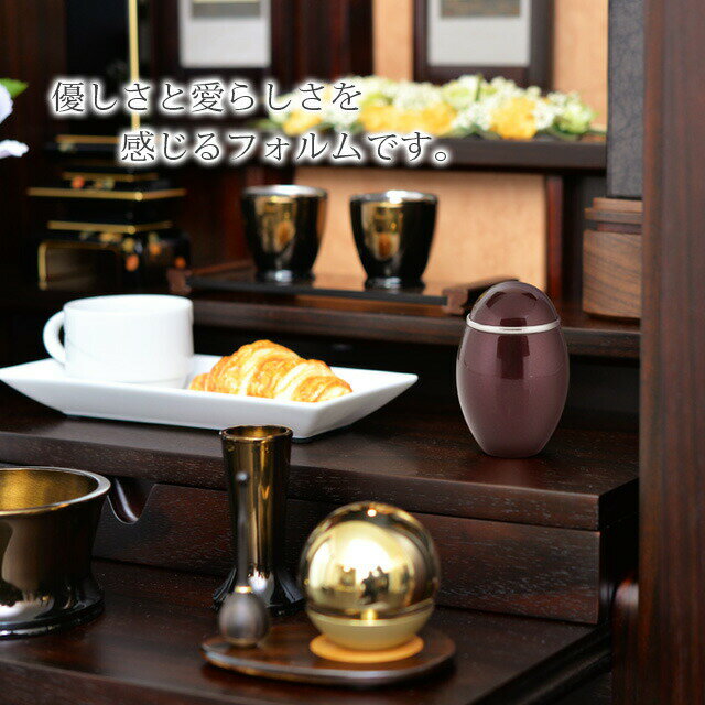 商品説明 艶やかな輝きが美しいミニ骨壺 可愛らしいフォルムで故人様の分骨やお遺灰、形見も保管できる『ミニ骨壷 ココス ワイン』。堅牢な造りとネジ込み式の上蓋を採用することで、大切な方のご遺骨をしっかりと守ります。 お好みで選べる美しいカラー 故人様のイメージやお仏壇、お部屋の雰囲気に合わせて選べるカラーは5色。丸みを帯びた優しい曲線のデザインとなっており、ゴールド、シルバーのラインを入れることで高級感を演出します。 【選べるカラー】 >>パールホワイトはこちら >>ゴールドはこちら >>メタリックピンクはこちら >>※レッドマーブルは売り切れました。 お部屋に馴染む美しいデザイン 艶やかな質感と優しいフォルムで、日常の空間に違和感なく馴染みます。お客様の好みに合わせて選べる5色展開です。分骨用としてはもちろん、お遺灰や故人様の指輪といった形見の保管にもお使いいただけます。 美しいフォルムと機能性 故人様の写真や思い出の品、香立てや花立などと自由に組み合わせしやすい高級感あるデザインとなっております。お部屋の好きな場所にご安置することで、より一層故人様を身近に感じることができます。 ネジ込み式で安心の構造 ネジ込み式の蓋になっており、骨壺が倒れても収納しているご遺骨がこぼれる心配がありません。しっかりと閉めることができ、適度な重さもあり安定感がありますので、大切な方のご遺骨をしっかりと守ることができます。 ご安置しやすい掌サイズ こちらのミニ骨壺ココスは、掌に収まる大きさで、お部屋やお仏壇にご安置しやすいサイズです。いつもの空間に、そっと寄り添う様に大事な故人様の存在を感じることが出来ます。 商品サイズ ミニサイズ 外寸:高さ5.1cm × 直径3.4cm 内寸:深さ2.3cm × 内径1.7cm レギュラーサイズ 外寸:高さ7.6cm × 直径5.1cm 内寸:深さ4.8cm × 内径3.2cm 材質 アルミ 備考 ※実際のサイズと若干異なる場合がございます。 ※実際の商品と色味が若干異なって見える場合がございます。 ※商品仕様につきましては予告なく変更することがございます。予めご了承ください。 ※メーカーの意向により、予告なく仕様の変更、または生産終了となる場合がございます。 その為ロットにより仕様が若干異なる場合がございます。 予めご了承いただけますようお願い致します。 ※楽天のシステムの仕様上金額の変更は、買い物かご内では反映されません。 ご購入確定後、弊社からの2通目のメールにて訂正した金額をお知らせいたします。 メーカー希望小売価格はメーカーカタログに基づいて掲載しています 外寸 内寸 ミニサイズ 高さ5.1cm × 直径3.4cm 深さ2.3cm × 内径1.7cm レギュラーサイズ 高さ7.6cm × 直径5.1cm 深さ4.8cm × 内径3.2cm