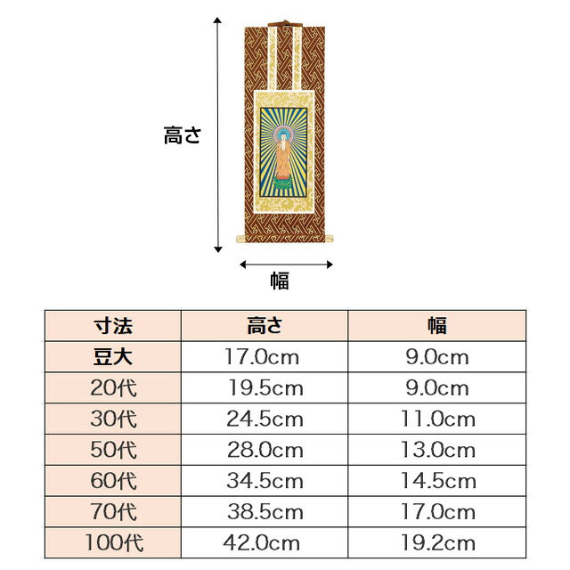 オリジナル掛軸 茶表装 ご本尊[掛け軸 御本尊様 ご本尊様 真言宗 浄土宗 浄土真宗本願寺派(西) 浄土真宗大谷派(東) 天台宗 曹洞宗 臨済宗 日蓮宗 禅宗] 商品説明 選べるサイズ 豆代〜100代の豊富なサイズをご用意しています。ご希望のサイズをご指定下さい。 御本尊様 各ご宗派のご本尊様です。左右両脇の掛軸をお求めの際は、別途ご購入ください。 希望のご宗派をお選びいただけます。 真言宗・浄土宗・浄土真宗本願寺派(西)・浄土真宗大谷派(東)・天台宗・曹洞宗・臨済宗・日蓮宗・禅宗をご用意しています。 記載の無いご宗派の場合は、その他をお選びいただき、決済に進んだ後の「備考」にご宗派をご記入ください。 ※商品画像は一例です。ご指定いただいた宗派の掛軸をお送りします。 追加オプション 掛け軸を留めるための「法輪鋲」をお得にお求めいただけます。 「法輪鋲」は、画鋲のように留める押し鋲です。 ■商品サイズ 豆代 高さ 17cm × 幅 9cm 20代 高さ 19.5cm × 幅 9cm 30代 高さ 24.5cm × 幅 11cm 50代 高さ 28cm × 幅 13cm 60代 高さ 34.5cm × 幅 14.5cm 70代 高さ 38.5cm × 幅 17cm 100代 高さ 42cm × 幅 19.2cm 備考 ※実際のサイズと若干異なる場合がございます。 ※実際の商品と色味が若干異なって見える場合がございます。 ※商品仕様につきましては予告なく変更することがございます。予めご了承ください。 ※楽天のシステムの仕様上金額の変更は、 買い物かご内では反映されません。ご購入確定後、 弊社からの2通目のメールにて訂正した金額をお知らせいたします。 ■単品/セット販売 ≫ オリジナル掛軸 茶表装 三幅セット ≫ オリジナル掛軸 茶表装 脇掛2枚1組セット
