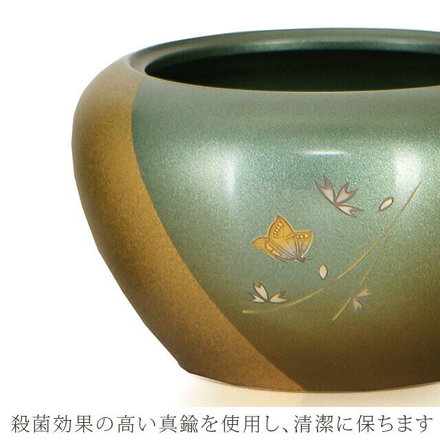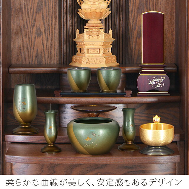 【仏具セット】なごみ マットグリーン 6点セット 3.0寸[モダン 銅 真鍮 彫金 送料無料] 商品説明 マットグリーンの輝きと蝶の彫金が美しい仏具セット マットグリーンのグラデーションの輝きと彫金で蝶の模様が施され、お仏壇に飾った際も一際存在感を放つ『なごみ マットグリーン』。真鍮で作られており、高い殺菌効果で衛生的に保ちます。 繊細な蝶の彫金が施された三具足 三具足と呼ばれる花立・香炉・灯立に蝶の彫金を施しました。全てに入れるのではなく、特に大事な三具足に施すことにより、メリハリがつき、お仏壇を上品に彩ります。 透き通るようなワインレッドのグラデーション 透明感のあるマットグリーンをベースに、下部はコハク色へと変化していきます。下部に落ち着いた色を配色しているため、外観の印象でも安定感があり、かつマットグリーンとコハク色のコントラストで、華やかさも両立させています。 安定感があり曲線が美しいフォルム 曲線を多用したデザインで、柔らかな印象の高さのある灯立や線香差、花立をはじめとした下部が広がったデザインは、安定感があり転倒などの心配事を軽減し、安心してお使いいただけます。 丈夫で長持ち、古くから使用される真鍮 銅の合金である真鍮で作られてた『なごみ マットグリーン』。真鍮の特徴は、殺菌効果があり、安心してお使いいただけます。丈夫で長持ちする代表的な金属として、古くから使われています。 お手入れが簡単! 茶湯器と仏飯器は、銀色のお皿のような「落とし」がついています。ご飯やお水の水気による腐食から仏具を防ぐため、必要な物です。「落とし」は外して洗えるため、お仏具を濡らすことなく、お手入れすることができます。 こちらの仏具セットはすべてのご宗派でお祀りいただけます 曹洞宗 真言宗 浄土真宗 西 東 本願寺派 大谷派 日蓮宗 浄土宗 時宗 天台宗 臨済宗 妙心寺派 禅宗 無宗派 他 商品サイズ 高さ 径(幅) 花立 9.5cm5.2cm 灯立 7.4cm(先端までの 8.7cm)3.8cm 前香炉 5.7cm9.7cm 湯茶器 4.6cm4.8cm 仏器 4.6cm4.8cm 線香差 7.4cm4.0cm 材質 真鍮 原産国 海外 備考 ※実際のサイズと若干異なる場合がございます。 ※実際の商品と色味が若干異なって見える場合がございます。 ※商品仕様につきましては予告なく変更することがございます。予めご了承ください。 ※液晶画面の見え方によっては、実際より色合いが濃く見える場合があります。 あす楽対応商品 メーカー希望小売価格はメーカーカタログに基づいて掲載しています寸 茶湯器 仏飯器 花立 香炉 灯立 線香差 3.0寸 高さ 4.6cm 4.6cm 9.5cm 5.7cm 7.4cm(先端までの高さ8.7cm) 7.4cm 径 4.8cm 4.8cm 5.2cm 9.7cm 3.8cm 4.0cm