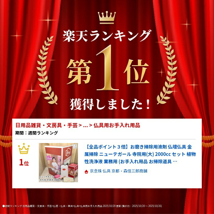 ご寺院やご家庭用の金属性仏具の汚れを簡単におとす濃縮洗浄液です。 従来の洗浄液では・臭いがきつい・磨くのに力が必要等、大変に手間がかかったお手入れも「ニューテガール」を用いると簡単で作業時間も大幅に短くなります。複雑な彫刻面もわずか30秒間「ニューテガール」を薄めた液に浸けるだけで手軽に洗浄できます。 ニューテガール 寺院用(大) 2000cc セット 商品説明 物にもよりますが約30秒漬けて拭き取るだけで金属汚れが綺麗になります。 名古屋城の金の鯱の清掃にも使われた実績のある商品です! 発売当初からロングセーラーの大ヒット洗浄液剤です! その洗浄効果は名古屋城の金のシャチにも使用されたくらいに抜群!オススメです! 原剤を溶かした水は1度で捨てないで! 洗浄効果はなかなか強く金属汚れが落ちにくくなるまで数回使えます! コスパ最強ですね(^O^) セット内容 ・ニューテガール 2000cc 1本 ・テガール・ダスター 200mm×300mm 1枚 ・真鍮ブラシ 1本 ・ナイロンブラシ 1本 ・スポンジ 1個 【宅配便 送料無料】 (液剤のため北海道・沖縄・離島は発送できない商品です)
