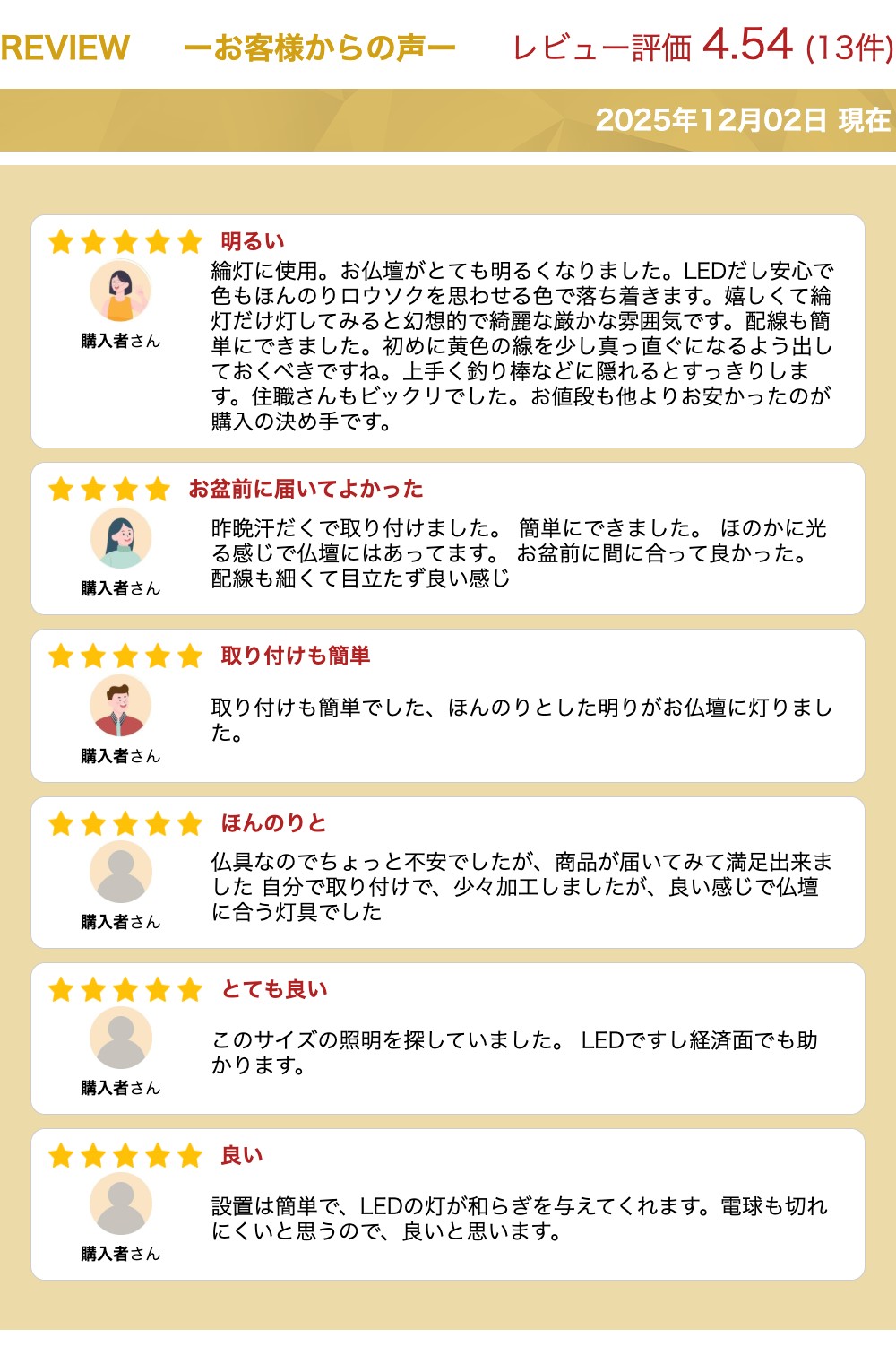 よく一緒に購入されている商品 LED 電装品 電気ロウソク コード2メート1,880円 LED 電装品 電気ロウソク コード長さ601,880円 仏壇 用 led 照明 ともしび3V用 延長750円 従来は蝋燭、輪灯など本物の灯明をお仏壇の中の灯りとしていましたが安全性やお仏壇を汚れないようにとのご要望から、現在では灯篭、輪灯などに照明用の電気製品が使われる事が一般的です。こちらのセットは電圧を3Vで使用し、従来品(同型比)に比べ明るい照明を実現しました。 本セットは本山輪灯・菊輪灯・桐輪灯・七宝輪灯用など、輪灯専用1対の器具です。 [セット内容・サイズ] アダプター:1個入 コードの長さ:ターミナルまで約250センチ 手元スイッチ付ACアダプター 家庭用100ボルトコンセントから使えます [ターミナル]:1個入 4灯まで接続可能 サイズ:3×1センチ [輪灯用コード]:1対入 コードの長さ約145センチ・黄色 サイズ:総長さ98ミリ胴径20ミリ 先端器具サイズ:長さ30ミリ×直径6ミリ ※本製品は電装品のみで輪灯本体は別売りです。 [対応仏壇]サイズ 上置型の仏壇 床置き型の場合は30号サイズまでなら延長コードなどは必要ないと思います。 [製造元] 中国製 [納期] ※2〜5営業日万が一欠品の場合は1週間ほどお待ちいいただきます。 ※危険ですので他の電装品を本製品に取り付けしないでください電流の容量は1個のアダプターで250ミリアンペアになります。増設される場合は容量にご注意ください照明器具の必要となる電流は下記のようになります。スポットライト1基…80ミリアンペア吊り灯篭用(1対)…100ミリアンペア電気ローソク(1本)…20ミリアンペア輪灯用(1対)…40ミリアンペア [商品区分:仏具・輪灯ト電装品・LED] 類似商品はこちら LED 電装品 輪灯球 コード1.5メートル1,800円LED 電装品 吊灯篭用1対+輪灯用1対セット5,980円仏壇 用 LED 電装品角度可変スポットライト8,697円 LED 電装品 スポットライト 角度可変式 3,980円仏壇 用 led 照明 仏壇の明かり 灯明 コ9,580円 LED 電装品 電気ロウソク コード2メート1,880円仏壇用 led 照明 従来仏壇 金仏壇 後付け4,180円 LED 電装品 増設用 ターミナル5穴 / 880円本山合釣付輪灯 本金メッキ仕上 3号 /41,220円新着商品はこちら2025/11/30数珠 男性用 特上 茶水晶 22珠共仕立 小田11,428円2025/11/30数珠 青虎目石22珠共仕立小田巻梵天房 各宗派15,620円2025/11/25贈答用線香 お供え ギフトに 人気 薫寿堂 5,500円再販商品はこちら2025/11/29しめ縄 450ミリ 藁製 神棚用[注連縄・しめ3,680円2025/11/20法名軸 新金上100代 紺色 / 金襴蓮華表3,780円2025/11/19納柩用品 副葬品 釣り具セット 2本入 奥行132,670円2025/11/30 更新※本セットは輪灯用(本山輪灯・菊輪灯用など)のみのセットになります。輪灯や瓔珞は付属していません電流の容量は1個のアダプターで250ミリアンペアになります。増設される場合は容量にご注意ください照明器具の必要となる電流は下記のようになります。スポットライト1基…80ミリアンペア吊り灯篭用(1対)…100ミリアンペア電気ローソク(1本)…20ミリアンペア輪灯用(1対)…40ミリアンペア