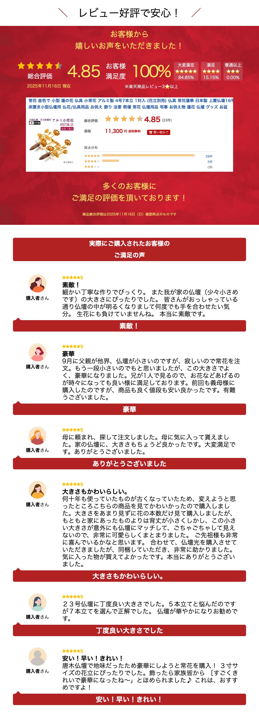よく一緒に購入されている商品仏具 花立 花瓶 真鍮製 上丸花立 色付 2.3,480円香炉 香呂 線香立て 仏具 仏壇用 丸型 机上7,680円高月タメ色3号1対入 /花 仏具用品 飾り 法1,380円水切りからの高さ:約12センチ上置型や小型の仏壇向け花立は2.5号(高さ75ミリ)又は3号(高さ9センチ)と合わせてください画像は2.5号の花立とあわせた例で総高さ約215ミリになります。※花立は別売りです※1対の価格です※製作時により多少大きさが異なります関連商品小常花 【アルミ製】 5号7本立 (1対) 金色 ( 花立 別売)/小...小常花 【アルミ製】6号7本立 (1対) 金色 ( 花立 別売)/小常...小常花 【アルミ製】6号9本立 (1対) 金色 ( 花立 別売) /仏...12,300円12,800円15,800円常花 金色で 小型 蓮の花 仏具 小常花 アルミ製 3号5本立(1対)...小常花【アルミ製】4号7本立(左のみ) 金色 ( 花立 別売) /小常...モダン過去帳 モダン仏具 過去帳 先祖の記録を記す仏具 ぬくもり 過去...9,980円5,980円11,300円類似商品はこちら常花 金色で 小型 蓮の花 仏具 小常花 アル9,980円小常花 金色 5号7本立 常花 金メッキ29,800円常花 蓮花 仏具 蓮の花 金色 アルミ製 8号18,800円小常花 5号7本立 金色 /小常花 仏具12,300円小常花 6号7本立 金色 /小常花 仏具 12,800円仏壇用 金の花 蓮花 常花 アルミ製 小常花 6,380円小常花4号7本立 金色 /小常花 仏具 仏5,980円小常花 7号9本立 金色 /小常花 仏具 17,800円金色の蓮の花 仏壇用 金の花 金常花 小常花 5,280円新着商品はこちら2025/7/14盆提灯 モダン 盆ちょうちん モダン提灯 3D7,980円2025/7/14盆提灯 モダン 盆ちょうちん モダン提灯 コー17,800円2025/7/10盆ちょうちん 盆提灯 回転提灯 木製 絵入 彩16,800円~再販商品はこちら2025/11/5小常花 アルミ製 3号5本立 金色 仏具5,280円2025/10/26極上品 遠山 三宝 4寸 木目が美しく格調4,800円2025/10/25数珠 女性用 ホワイトカルサイト 7ミリ共仕立6,480円2025/11/17 更新