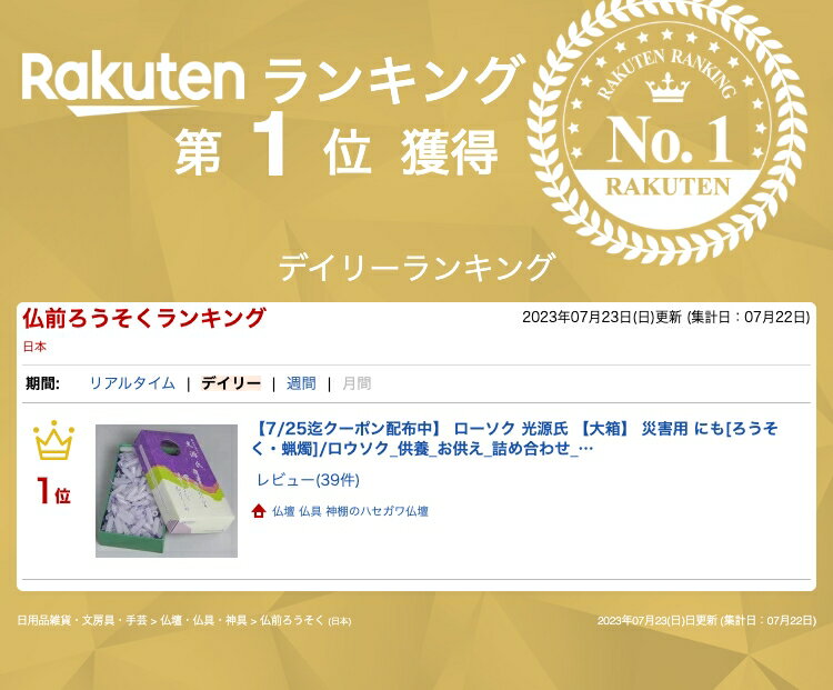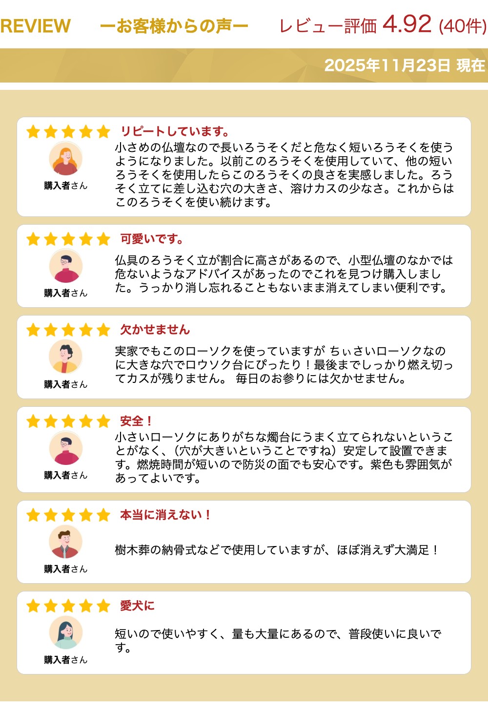 よく一緒に購入されている商品仏具 ろうそく 特選 プチ40分151-01 718円線香 名香 好文木 大箱バラ #500 梅栄堂2,730円ロウソク 光源氏 災害用 にも /ロウソク 605円毎日のおまいりの際に一度で使いきるのことのできる、長さ2.5センチの小さなローソク。 燃焼時間は約8分。従来のローソクは短い物でも、燃焼時間が20分前後で、毎日のおまいりには少し長くありませんでしたか?『光源氏 ローソク』は約8分で燃えきってしまうから、忙しい毎日のおまいりに使うには、ちょうど良いサイズ。最後まで燃えきってしまうから、安心でローソク立てのお掃除も簡単!特別な製法により、底部分の差し穴の大きさが大きく、奥深くまで均一に開いているので、燭台にピッタリ安定します。 ※新創作燭台「もえ」と併用すれば、最後の一滴まで完全燃焼する 理想的なお灯明が実現します。是非一度お試し下さい!■サイズ:長さ25ミリ×直径7.2ミリ■本数:約260本入■標準燃焼時間:8分■火立の芯を差し込む穴が一定の大きさで きちんと空いています。■厳選した原材料を使用していますので 炎が安定しています。関連商品ロウソク 星のしずく (約100本入り)【ろうそく・ローソク・蝋燭】/...ミニロウソク ろうそく ミニ 亀山五色蝋燭 (筒型)[2箱入セット]A...御供 進物 贈答用 ろうそく ジョッキ ロウソク ミニジョッキ G カ...550円3,680円820円類似商品はこちらロウソク 光源氏 災害用 にも /ロウソク 605円ロウソク 星のしずく /ロウソク 供養 お供550円ロウソク 植物性 ろうそく 菜30 約170g660円贈答用 ロウソク 絵 ローソク アソート8本2,750円絵 ロウソク 2本入 /ロウソク 供養 お供え825円植物 ロウソク 15分 fs015 カメヤマ 660円ろうそく ロウソク 仏壇用 蝋燭 花びら形 ロ620円ろうそく 長時間 ローソク 蓮型 蝋燭 フル1,210円ろうそく ロウソク 仏壇用 蝋燭 ミニ ローソ1,480円新着商品はこちら2025/11/24玉初堂 高級線香 進物用 沈水 清閑 短寸8把10,800円2025/11/20仏壇 地袋付仏間用 京型 彫欄間蒔絵入六角 菖742,000円2025/7/14盆提灯 モダン 盆ちょうちん モダン提灯 3D7,980円再販商品はこちら2025/11/20法名軸 新金上100代 紺色 / 金襴蓮華表3,780円2025/11/19納柩用品 副葬品 釣り具セット 2本入 奥行136,300円2025/11/5小常花 アルミ製 3号5本立 金色 仏具5,280円2025/11/24 更新
