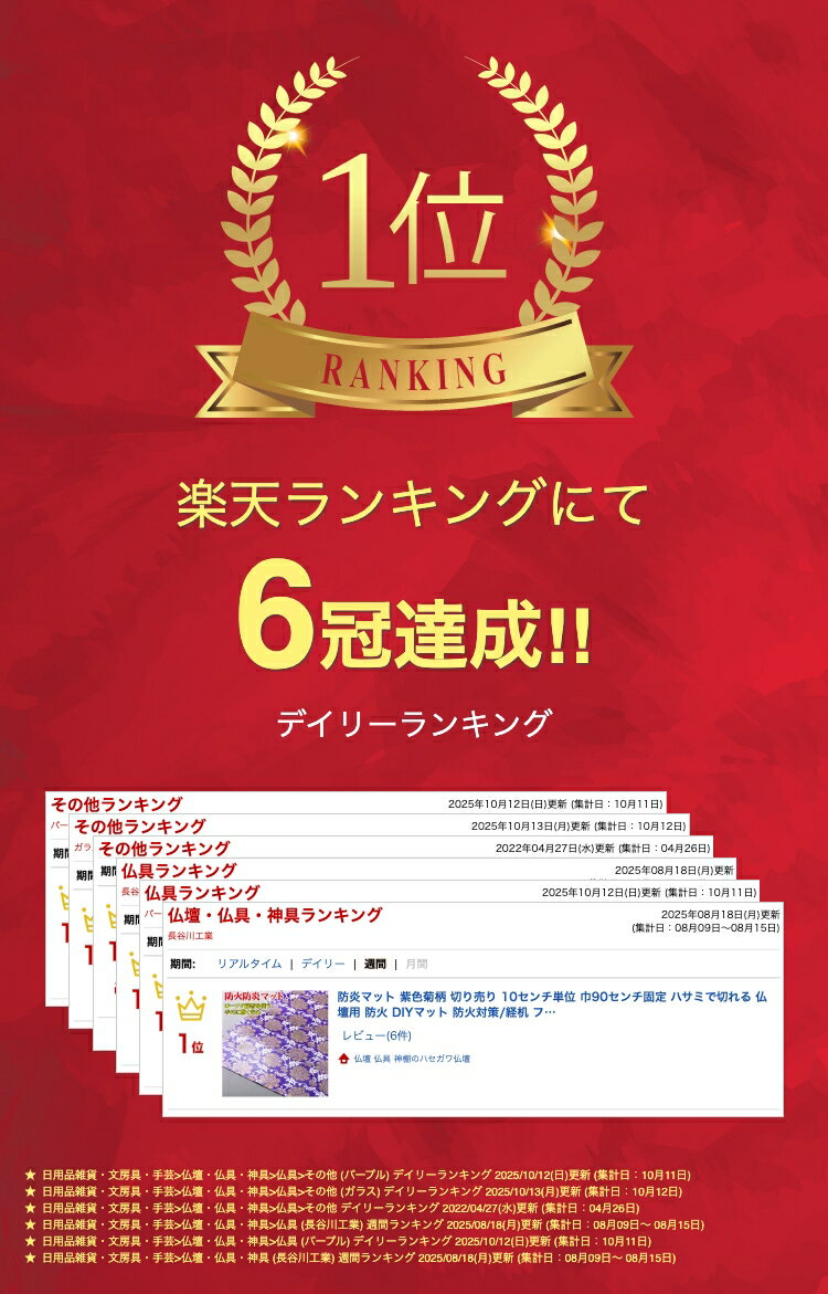 よく一緒に購入されている商品茶器 茶碗 湯呑 仏具 水入れ 仏具 陶器製 280円榊立4.5寸 478円香炉灰 仏壇用 極上香炉灰 もみ灰100% 丸258円・表面は経机用防炎マットと同じ素材で 裏面がフェルト生地になっています。・一般のハサミで切ることができるので 仏壇の棚などに敷いて傷やちょっとした焦げを 防止することができます・完全な防火対策として作られているのではないので チョット線香を倒したとか、ローソクを倒した時に 焦げから守ることができると考えてください【ご注文方法について】 販売単位は巾90センチ(固定)で長さが10センチ単位で の販売になります。 希望の長さ分だけ注文数量を変更してご注文下さいませ。※長さが30センチ必要な場合は注文数「3」にしてください。 長さ1メートル必要な場合は注文数「10」にしてください・色は紫色マットの販売になります・ガラスクロスとアルミ箔を主構成素材としています。※発送までに3〜6営業日掛かりますのでお時間には余裕をもってご注文下さい。関連商品仏壇用 敷き物 仏具 マット 防炎マット 黒色 鳳凰柄入 切り売り 長...経机掛け 防炎マット 経机マット 安全マット 経机14号 巾42cm用...[仏具 単品販売] やわらぎ 仏器 仏飯器 ゆず色 (薄めの黄色) 陶...1,280円1,280円1,280円類似商品はこちら仏壇用 敷き物 仏具 マット 防炎マット 黒色1,280円仏具 敷き物 マット 敷物 防炎マット 防火マ2,280円仏具 敷き物 マット 敷物 防炎マット 防火マ1,780円仏具 敷き物 マット 敷物 防炎マット 防火マ3,680円経机掛け 防炎マット 経机マット 安全マット 1,280円経机掛け 経机マット 安全マット 経机16号 1,480円防炎マット 防火マット 経机 22号用 幅543,380円 防炎マットNo1166センチ × 50センチ13,800円仏具敷きマット 印伝調上置用経敷 不織布貼り 1,925円新着商品はこちら2025/7/14盆提灯 モダン 盆ちょうちん モダン提灯 3D7,980円2025/7/14盆提灯 モダン 盆ちょうちん モダン提灯 コー17,800円2025/7/10盆ちょうちん 盆提灯 回転提灯 木製 絵入 彩16,800円~再販商品はこちら2025/11/5小常花 アルミ製 3号5本立 金色 仏具5,280円2025/10/26極上品 遠山 三宝 4寸 木目が美しく格調4,800円2025/10/25数珠 女性用 ホワイトカルサイト 7ミリ共仕立6,480円2025/11/15 更新
