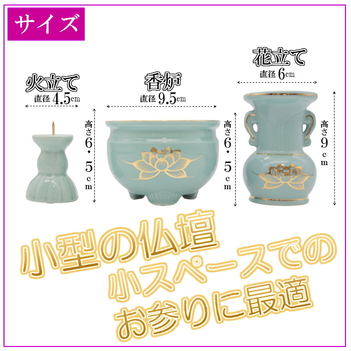 商品情報サイズ香炉:口径9.5cm×高さ6.5cm火立て:口径6cm×高さ9cm花立て:口径6cm底×高さ9cmセット内容香炉×1火立て×1花立て×1※火立ては多少のデザインが変更になる場合がございます(サイズは変わりません)材質陶磁器生産国日本製注意事項●製造上、手作業の工程が多いため、すべての商品が完全に同じではなく色合いの違い、ごくわずかな小傷等が出る場合があります。ご了承ください。●お使いのブラウザやモニターによって実際の色と若干異なる事がございます。ご了承下さい。●加熱等による火災、変形、変色防止の為に、直接日光やストーブ等、熱、冷暖房機器の風が直接当たらない所でお使い下さい。備考●若干のサイズ誤差がございます●画面によって色合いが異なって見える場合がございます。●実店舗でも販売中のため、お急ぎの方はお気軽にお問合せ下さい(042-974-3200 11:00-15:00 仏壇センター担当者宛)管理コード840-0789(C)明 : 要この商品は 【仏具】仏具セット ミニ 3点セット モダン仏具 仏壇仏具 [花立 香炉 火立て] 三具足 3具足 小型 マンション リビング フローリング具足 仏壇 モダン ミニ仏具 ミニ仏壇 小型仏具 小型仏壇 仏具用品 仏壇用品 家具 現代仏具 モダン 佛具 ポイント 【送料無料】シンプル3点仏具セット。艶のある陶器製で、どんなお仏壇にも良く合います。 日本製でお手頃価格!シンプルこその機能性! 国産の質の高い素材でできた陶器3点仏具セットです。灯立て、香炉、花立、香炉灰(サービス)がセットとなっています。シンプルなデザインだからこその使い勝手の良さがあります。金蓮柄のデザインがアクセント。仏壇はもちろん、様々な供養の際にお使いいただけます。 ショップからのメッセージ 【ショップからのメッセージ】こんにちは!店長のコサカです。当店は「最良の商品」を「最適な形」で「最高の満足」をお客様に提供することをモットー(理念)に、現代、お客様のニーズに合った商品を紹介させていただいております。【オススメポイント】●伝統的かつ小型で小スペースにも飾れます。●小さくても機能性を重視したシンプルなデザイン。●お手頃価格ながら安心の日本製●実店舗でも人気の商品です。 納期について 通常2営業日以内に発送します(一時欠品時は1週間前後) 4