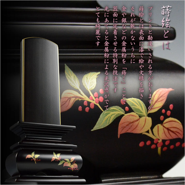 制作前に文字校正【配置図】は送っておりませんので、ご心配の方は文字代金と同時に【配置図】をご注文ください。 制作済みのお位牌は、文字の修正出来ませんので、あらかじめご了承ください。 ◆人気の塗り位牌【南天】の唐木ヴァージョン新登場 札板を面粉(金)で縁取りした豪華版 札板はもちろん、台座やパーツなどの全てを黒檀材でお造りした贅沢な総黒檀製 高価な黒檀材がもつ天然木の温かみや重厚感・高級感が伝わってきます 黒の力強さと、その中に見え隠れする茶の木目が上品な落ち着きを与えます どの色のお仏壇にもよく合います 豪華な唐木に華やかな蒔絵が美しくモダンに映えます。 蒔絵は正面に「南天」、上部に「桐」を施し、見る人をやさしく和ませてくれます 【蒔絵とは】プリントと勘違いされる方がおりますが、蒔絵とは表面に漆で絵や文様を描き、 それが乾かないうちに金や銀などの金属粉を「蒔く」ことで器面に定着させる特別な技法です 光にあてると金属粉による光沢感がでて、とても綺麗です ※唐木(黒檀・紫檀)は天然木ですので、色や木目に一つとして同じ物がございません 写真は商品の中から無作為に選んだ一つを撮影しておりますので一例としてお考えください ※蒔絵は手作業で製作しておりますので絵柄など若干個体差がございます 位牌専門店だから出来た仏縁堂オリジナル! おかげさまで、特許を取得! 特許:意匠登録 第1464071号 他店では販売しておりません 弊社の御位牌は、楽天【位牌】検索でも常に上位で大変売れており 皆様に大好評、大人気を得ております 在庫を切らした場合、入荷までに3ヶ月程かかりますので、お早めのご注文をお願いします ■サイズ/単位はmm ・3.0寸 台幅70×総高151×奥37 札幅38×札高91 ・3.5寸 台幅76.5×総高170×奥39 札幅44×札高105 ・4.0寸 台幅83×総高187×奥43.5 札幅50×札高119 ・4.5寸 台幅88×総高207×奥45 札幅54.5×札高125 ・5.0寸 台幅99×総高229×奥48.5 札幅64.5×札高150 ※手作りのため、サイズは5mm前後の誤差が生じることがございます ※サイズに依り価格が異なります。商品タイトルでご確認ください ※商品は位牌本体の価格となります。文字入れをご希望の場合、別途「文字入れ代金」がかかります ■材質:黒檀材 ■表面仕上げ:ウレタン塗装 ■原産国:海外 ■送料無料(但し沖縄・離島は別送料かかります) ■綺麗な文字と評判の【文字入れ代】のご注文はコチラ ※お位牌本体と文字入れ代をカート(買い物かご)に入れましたら、注文ステップ3にでてきます【位牌戒名入力フォーム】に戒名など必要な情報をご入力下さい。 彫り・書き共に対応、書体も多彩に取り揃えております。連名をお入れすることもできます。 ※お位牌にお入れするお文字は、注文ステップ3でご入力できます。入力欄はこちらのようになっております。 ※お文字の配置の確認はこちらをご覧ください。(新しいウインドウで開きます) ※お文字を入れたサンプルはこちらをご覧ください。 蒔絵位牌 南天3.0寸 蒔絵位牌 南天3.5寸 蒔絵位牌 南天4.0寸 蒔絵位牌 南天4.5寸 蒔絵位牌 南天5.0寸 蒔絵位牌 南天紫檀3.0寸 蒔絵位牌 南天紫檀3.5寸 蒔絵位牌 南天紫檀4.0寸 蒔絵位牌 南天紫檀4.5寸 蒔絵位牌 南天紫檀5.0寸 蒔絵位牌 南天黒檀3.0寸 蒔絵位牌 南天黒檀3.5寸 蒔絵位牌 南天黒檀4.0寸 蒔絵位牌 南天黒檀4.5寸 蒔絵位牌 南天黒檀5.0寸