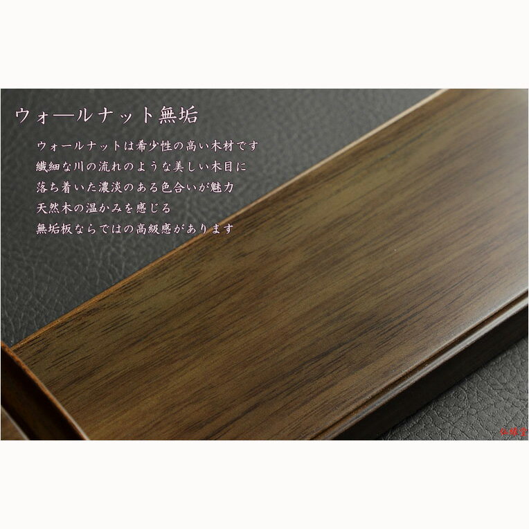 制作前に文字校正【配置図】は送っておりませんので、ご心配の方は文字代金と同時に【配置図】をご注文ください。 制作済みのお位牌は、文字の修正出来ませんので、あらかじめご了承ください。 ◆シンプルでありながら豪華に見映えする「銀水」シリーズ 現代に調和したモダンなデザインは 洋間やリビングにピッタリ 希少な天然無垢材を使用した 贅沢な重厚感と流れるような美しい木目が魅力 現代的でシンプルなデザイン モダンな現代調仏壇や家具調仏壇に調和する リビング位牌です 位牌専門店だから出来た仏縁堂オリジナル! 特許:意匠登録 第1450472号取得済 他店では販売しておりません 在庫を切らした場合、入荷までに2ヶ月程かかりますので お早めのご注文をお願いします ■3種類の銘木を使用した銀水シリーズ ※商品タイトルにてご確認下さい 【黒檀無垢】はコチラ 黒檀は成長過程に年月を要する為 希少価値が非常に高く、入手が難しい木材です 天然木の黒檀は遠目には黒い木肌に見えますが よく見ると黒地に流れる茶の木目があり しっとりとした艶のある質感と 優雅な高級感を感じさせます 【紫檀無垢】はコチラ 赤や紫色を帯びた優美な色の紫檀は 現在は大変希少性の高い木材です 紫檀の目の詰まったズシリとした木目は 唐木無垢材の証であり、大きな魅力のひとつです 【ウォールナット無垢】はコチラ 世界3大銘木の一つ ウォールナットは希少性の高い木材です 繊細な川の流れのような美しい木目に 落ち着いた濃淡のある色合いが魅力 天然木の温かみを感じさせる 無垢板ならではの高級感があります ■タモ無垢材銀水シリーズはコチラ ■モダン塗り位牌・銀水シリーズはコチラ ■サイズ:4.0寸 総高さ 173mm 台幅 69mm 札幅 49mm 台高 52mm 札高 121mm 台奥 35mm 札厚さ 13mm ■注意事項: ※手作業で製作している為 サイズに5mm前後の個体差がございます ※コチラの商品は4.0寸のみ ※写真の仏壇・本尊・仏具などは別売です ※天然木使用の為、木目の出方・色味に個体差がございます ※文字代金は別売です お位牌への戒名・法名など文字入れをご希望の方は 別途【文字入れ代】をご注文くださいませ ■送料無料(但し沖縄・離島は別送料かかります) ■綺麗な文字と評判の【文字入れ代】のご注文はコチラ ※お位牌本体と文字入れ代をカート(買い物かご)に入れましたら、注文ステップ3にでてきます【位牌戒名入力フォーム】に戒名など必要な情報をご入力下さい。 彫り・書き共に対応、書体も多彩に取り揃えております。連名をお入れすることもできます。 ※お位牌にお入れするお文字は、注文ステップ3でご入力できます。入力欄はこちらのようになっております。 ※お文字の配置の確認はこちらをご覧ください。(新しいウインドウで開きます) ※お文字を入れたサンプルはこちらをご覧ください。 銀水 シックブラウン3.5寸 銀水 シックブラウン4.0寸 銀水 シックブラウン4.5寸 銀水 ワインレッド3.5寸 銀水 ワインレッド4.0寸 銀水 ワインレッド4.5寸 銀水 紫檀材 4.0寸 銀水 ウォールナット材 4.0寸 銀水 黒檀材 4.0寸 銀水 蒔絵位牌 梅3.0寸 銀水 蒔絵位牌 梅3.5寸 銀水 蒔絵位牌 梅4.0寸 銀水 蒔絵位牌 梅4.5寸 銀水 蒔絵位牌 梅5.0寸 銀水 蒔絵位牌 蝶3.0寸 銀水 蒔絵位牌 蝶3.5寸 銀水 蒔絵位牌 蝶4.0寸 銀水 蒔絵位牌 蝶4.5寸 銀水 蒔絵位牌 蝶5.0寸 銀水 形見箱付き 偲び桜蒔絵4.0寸 銀水 形見箱付き 偲び桜黒檀 蒔絵4.0寸 銀水 形見箱付き 偲び桜紫檀 蒔絵4.0寸