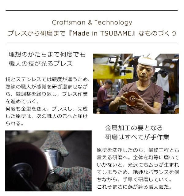 商品詳細 Made in TSUBAME Kalita カリタ ドリップポット スリム 700CU #52203 銅は熱伝導性がよく、温まりやすいため、 何度も注ぎ分けるハンドドリップコーヒーに向いています。 メッキ加工を施していますので、水質の変化はおきません。 TSUBAME 世界的にも高度な金属加工技術で知られる新潟県燕市。 越後平野のほぼ中心部に位置する金属加工の町。 金属洋食器の生産では、国内の90%以上を占めている。 金型製作、鋳造、プレス、研磨など、工程毎に専門特化した 工場と職人たちが、日夜その技を磨き続けている。 この町の厳しい品質基準をクリアした証、 『Made in TSUBAME』の刻印が輝く、銅・ステンレス製アイテムシリーズ。 『Made in TSUBAME』の証 燕商工会議所が認めた製品のみが名乗れる地域ブランド「Made in TSUBAME」を取得。 世界に誇る燕の技とプライドが込められた製品であることを証明しています。 研磨が魅せる輝き ポットからドリッパー、メジャーカップまで。 研磨職人が丹精込めて磨き上げることで、洗練された輝きを放つ製品が完成しました。 ロゴマーク 『Made in TSUBAME』のロゴマークは、「燕」の漢字がモチーフになっている。 【商品詳細】 JANコード:4901369 522034 本体サイズ(mm):240×100×190 化粧箱サイズ(mm):238×108×190 商品重量:547g 材質:銅製 満水容量:700ml 本体重量(g):約400 日本製