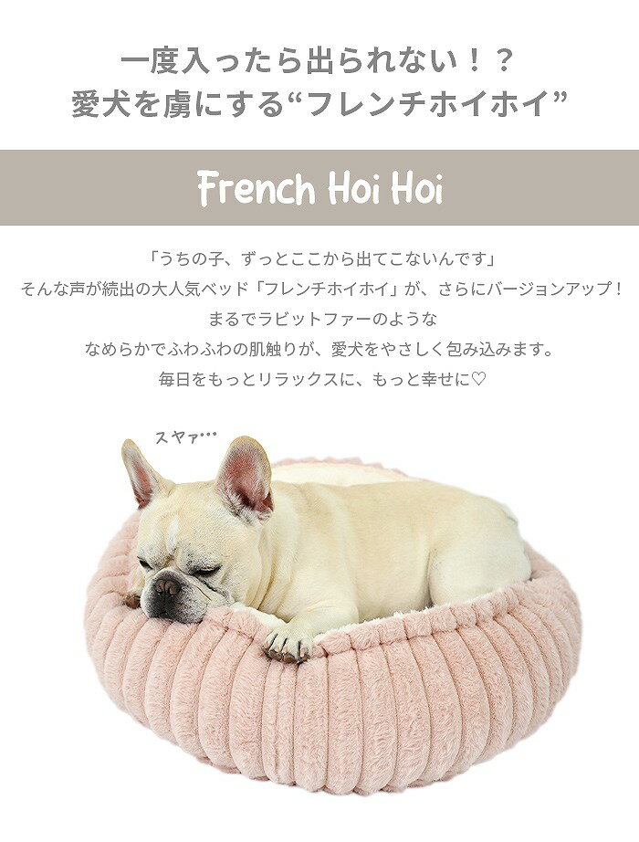 新型フレンチホイホイ KM865G 人気のフレンチホイホイがバージョンアップ!まるでラビットファーのような肌触りでぬくぬく♪ 【商品番号】KM865G 【コメント】 当社オリジナルペット用ベッド『フレンチホイホイ』。 一度入ったら出られない!? 愛犬を虜にする“フレンチホイホイ” 「うちの子、ずっとここから出てこないんです」 そんな声が続出の大人気ベッド「フレンチホイホイ」が、 さらにバージョンアップ! まるでラビットファーのようななめらかでふわふわの肌触りが、 愛犬をやさしく包み込みます。 毎日をもっとリラックスに、もっと幸せに☆ ●うっとりするほど柔らかい 思わずぎゅっと抱きしめたくなる、ラビットファーのような “ふわふわ極上触感”でワンちゃんを優しく包み込みます。 ●洗濯可能で清潔をキープ 今回のフレンチホイホイは全てのカバーが取り外せるようになり、 汚れたら気軽に洗えるので清潔を保てます♪ ●リバーシブルクッション 内側のクッションはリバーシブル仕様で 気分やインテリアに合わせて使い分け可能。 ●ノンスリップ加工 底面には滑り止め付きで、フローリングでもズレにくく安心。 ●中綿補充可能 クッションの厚みが物足りない場合は、ドーナツ部分も 真ん中のクッションもファスナー開閉可能なので、 市販の綿やお手持ちの古着など補充して調整可能です♪ ●インテリアに合わせやすいカラー展開 落ち着いた色味で、お部屋の雰囲気を邪魔しないニュアンスカラーを採用♪ ナチュラル・北欧・韓国インテリアなど、さまざまなテイストの空間に自然になじみます。 ※※ ご注意ください ※※ 入荷時より圧縮した状態でお届けいたします。 製品を受け取ったらパッケージを開き、空気を入れるように パンパンと叩いて、ふわふわになるように手動で調整してください。 空気が十分入り込むようにして数時間置くと、次第にボリューム感が 戻ります。 【サイズ】 60サイズ:直径約60cm×高さ約25cm×内寸直径35cm ※中綿の入り方により表示している数値に多少誤差が生じる場合がございます。 【ご注意】 製造時期によりサイズ・デザインに変更がある場合がございます。 画像のカラーは撮影時の照明等の具合により実物と異なる可能性がございます。 丁寧に検品しておりますが海外製品のため、日本製品に比べて生地キズや汚れ、糸のほつれなど裁縫の甘い部分があります。ご了承ください。 2