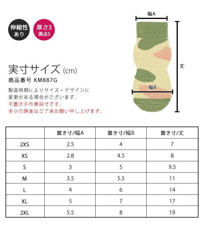 【商品番号】 KM887G 【カラー】 Gグリーン BRブラウン ※生産時期により色みに個体差があります。 【サイズ】 ※画像参照 【素材】ポリエステル、ポリウレタン 【厚さ】3(満点5) 【伸縮性】3(満点5) 【コメント】 ふわふわパイル地犬用ソックス 1SET 4足入り いろんなシーンで活躍 寒い季節だけでなく、春や秋の夜のお散歩や、 冷房のきいた室内でも快適にお使いいただけます。 高い伸縮性 柔らかい素材 愛犬の足に優しくフィット 夏の散歩のやけど防止 冬の散歩の凍傷予防 シニア犬のケガ予防 傷口の保護 汚れ防止 【ご注意】 製造時期によりサイズ・デザインに変更がある場合がございます。 画像のカラーは撮影時の照明等の具合により実物と異なる可能性がございます。 丁寧に検品しておりますが海外製品のため、日本製品に比べて生地キズや汚れ、糸のほつれなど裁縫の甘い部分があります。ご了承ください。 【キーワード】 汚れ防止 滑り止め付き 滑り止め 靴下 ソックス レッグウォーマー 防寒対策 暖かい 可愛い 柔らかい 冬 お散歩 お出かけ 寒さ対策 コーギー フレンチブルドッグ パグ ボストンテリア いぬ 犬 プードル ブルドッグ 中型犬 小型犬 フレブル フレブル用 ブヒ フレブルサイズ 犬 マルチーズ トイプードル