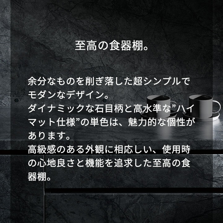 【シリーズ説明】 至高の食器棚。 余分なものを削ぎ落した超シンプルでモダンなデザイン。 ダイナミックな石目柄と高水準な「ハイマット仕様」の単色は、魅力的な個性があります。 高級感のある外観に相応しい、使用時の心地良さと機能を追求した至高のキッチンボード(カップボード)シリーズです。 【商品説明】 ・高級感のある外観 石目柄:ダイナミックな流れのある柄に加え、濃淡の抑揚がバランスの良い、表情豊かな石目柄。石の質感を感じさせる上品な艶と少しひんやりとする触り心地が特徴です。 単色(ハイマット仕様):光反射率を極限に抑えた高水準のハイマット仕様。その質感は厚みを感じさせ、触り心地が滑らかでしっとりとしています。特殊なコーティングが施されており、擦り傷に強い素材です。 ・ハイグレード仕様のアーキテック引出 フルスライド引出で奥の収納物まで見渡せます。見た目も美しく滑らかに心地よく閉まります(耐荷重30kg)。 ・扉用ダンパー 扉部は優しく閉まるソフトクローズ設計。絶対的な品質を誇るブルム丁番を使用しています(幅140、160、180cmのみ)。 ・家電収納部内にコンセントが付いています。 ・家電収納 蒸気が出る家電類など、使いやすいところまで引き出してご使用いただけます(収納内部には配線コードが邪魔にならないよう、コンセントフックが付いています)。 【サイズ】 幅:1200mm 奥行:445mm 高さ:941mm 【表面材】 正面:メラミン樹脂化粧繊維板 側面:オレフィン化粧繊維板 【耐荷重】 天板:約50kg 引出:約30kg(1杯あたり) 棚板:約20kg(1枚あたり) スライドテーブル:約10kg 【ホルムアルデヒド放散等級】F☆☆☆☆リフォーム 新築 リノベーション マンション 戸建て