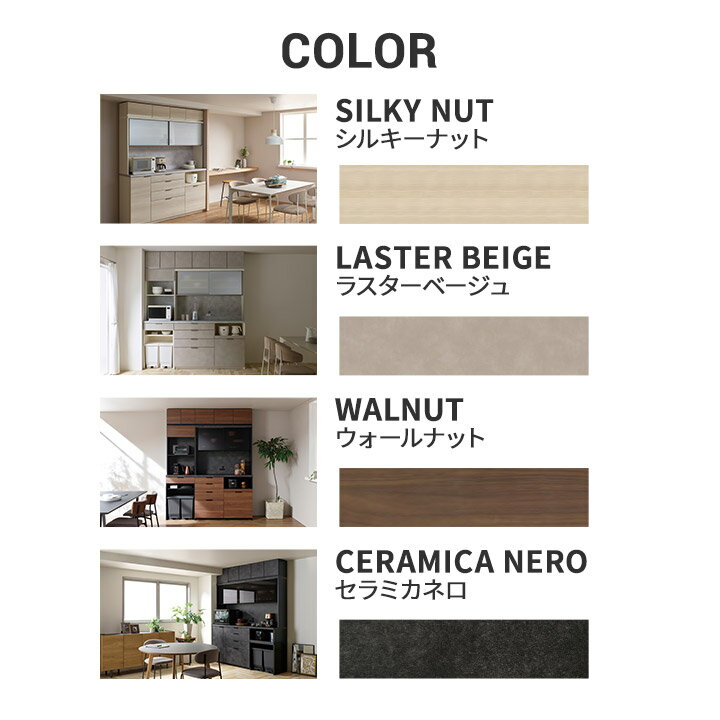 【シリーズ説明】 家電やキッチンツール、食器棚ストックなど様々なものがあふれるキッチンスペース。 必要な機能がまとまったハイカウンターが特徴で、デザイン性にも優れています。 カラーは4色からお選びいただけます。 【商品説明】 ・SmartNANOトップ カウンター天板はナノレベルで強化されたコートが施されていますので、スリ傷に強い仕様になっています。 ・引き戸仕様 食器が取り出しやすいワイドビュー設計 ガラスには飛散防止フィルムを貼っており、破損しても破片が飛び散りません。 ・静かにゆっくり閉まるサイレント引出 高さが異なる大中小の引出は収納の使い分けがしやすく、広く引き出せるので、奥の収納物まで見渡せます。 ・下台家電収納 蒸気が出る家電類など、使いやすいところまで引き出してご使用いただけます。収納部には配線コードが邪魔にならないよう、コンセントフックが付いています。 【サイズ】 幅:1800mm 奥行:500mm 高さ:1978mm 【耐荷重】 棚板:約20kg(1枚あたり) 引出し:約15kg(1杯あたり) カウンター天板:約50kg スライドテーブル:約10kg【ホルムアルデヒド放散等級】F☆☆☆☆リフォーム 新築 リノベーション マンション 戸建て