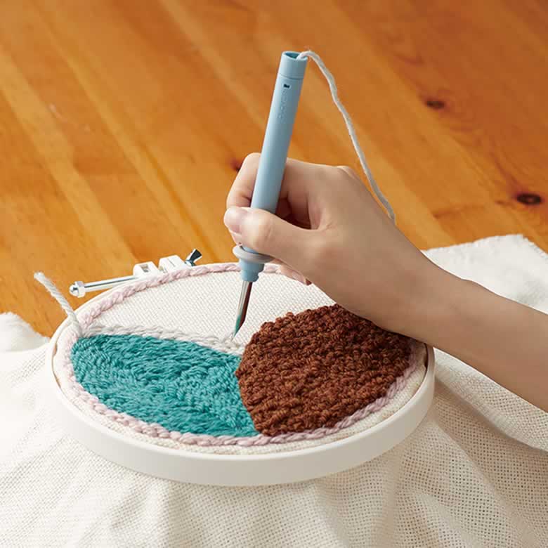 お好みの並太〜極太毛糸があればすぐできます。 セット内容 1)パンチニードル ・パンチニードル(コマ3個付) 1本 ・シリコンリング 1個 ・使い方説明書 1枚 【糸通し用】 ・とじ針 1本 ・たこ糸 1本 原産国:日本 2)パンチニードル用フープ〈18cm〉 内容物:外枠 1個、内枠 1個、脚 4個 パンチニードルに適した直径18cmの刺しゅう枠です。 使用する針の長さによってフープの高さを基本の4.5cm、付属の脚を取り付けて8.8cmの2段階で使用できます。 3)パンチニードル用ファブリック〈50×55cm〉 太い針が通りやすく、柔らかい風合いのパンチニードル専用の生地です。 内容物:50×55cm 材質:綿 100% 原産国:日本 4)パンチニードル用ボンド ステッチのほつれ止めに 内容物:内容量40g 種類:水性形接着剤 成分:ウレタン・アクリル樹脂50%、水50% シリコンペーパー 付き A4サイズ 原産国:日本イラストを描くように楽しくステッチ。 毛糸を通したニードルを使って、イラストを描くようにステッチを刺します。 ループの高さは4段階に調節可能です。(針先の長さ 2.5cm、3.5cm、4.5cm、5.5cm) 適した毛糸は並太〜極太毛糸。棒針表記で6〜12号のストレートの毛糸です。(※6〜12号表記でもすべての毛糸が適しているわけではありません。)