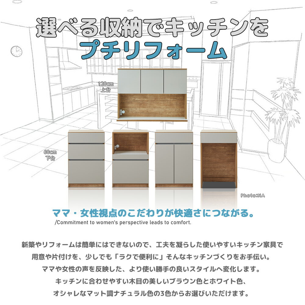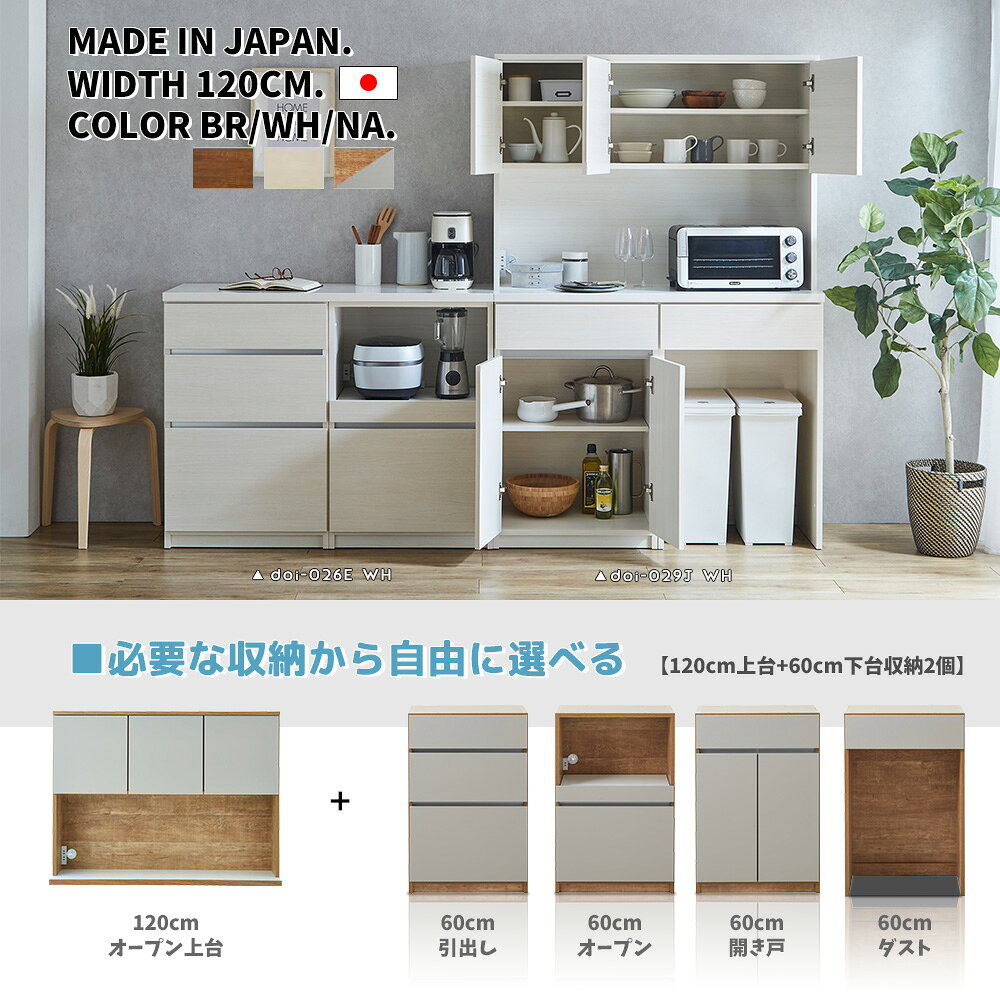 キッチンボード 食器棚 120cm幅 キッチン収納 選べる セミオーダー カスタム 自由 連結式 完成品 おしゃれ 開き戸 引き出し ダスト シンプルモダン 北欧 木製 国産 大川家具