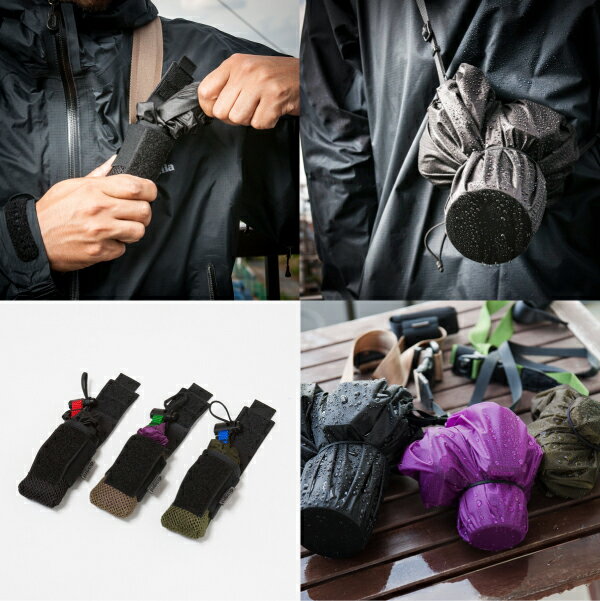 『雨やホコリから大切なカメラを保護する。』表地には軽量かつ強度が高いコーデュラリップナイロンを使用。滑らかでソフトな生地は、カメラを傷つける事無く素早く覆う事が出来ます。 お手持ちのニンジャストラップにマウントできる専用ケースが付属されているので、降雨の際はさっと取り出してカメラを保護し、雨がやんだら小さくまとめて収納する事が可能。また表地は撥水力が強く、軽くはたくだけで殆どの水滴を飛ばす事ができます。ケースには、そのまま収納しても大丈夫な風通しの良いアーミーメッシュを使用。装着方法は至って簡単。図1のように色がついたタブを目印にして、タブが上にくる様にカバーをレンズ側から覆います。図2のようにファインダー側でカバーが重なりますが、タブがついてる側を上に重ねてください。その時にカメラやレンズのサイズに合わせて、カバーの余りを無くすようにコンパクトに覆うのがコツです。図3のようにプラスチックパーツが無い側のゴムをつまんでカメラの底を通し、レンズに引っ掛けてカバーをカメラにフィットさせます。図4のように、アジャスターをつまんでゴムに付いているプラスチックパーツを引っ張り締め上げると、より隙間をなくしカバーをフィットさせる事ができます。カラー〔ケース:Black / シェルター : Black〕 〔ケース :Brown / シェルター : Purple〕〔ケース:Olive / シェルター : Khaki〕適応サイズ:小型〜大型一眼レフ こちらの商品は『完全防水』ではございませんのでご了承ください。また撥水力も永久的ではございません。市販の撥水スプレーでのお手入れを推奨いたします。原産国:日本Sサイズはこちら《カメラシェルターSサイズ》