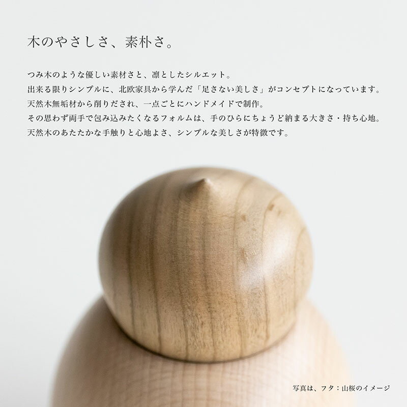 検索用キーワード ミニ骨壷 骨壺 赤ちゃん ペット 分骨 かわいい ・素材:フタ/山桜 骨壷本体/ブナ ・サイズ 骨壷本体 直径約60x高さ約84mm ちびてんしじぞう 直径約25x高さ約33mm 内容量 約15~20cc(大さじ1杯ほど) ※手仕事品のため、プラスマイナス1~2mm前後の個体差がございます。 ※目安サイズです。手仕事品のため、若干の差が出ることがあります。 ・カラー:ナチュラル/ブラウン ※モニターの発色の具合によって実際のものと色が異なる場合がございます。ミニ骨壷 木製骨壷つみき フタ:山桜&ちびてんしじぞう(ほっこり)セット
