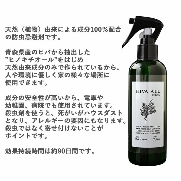 商品詳細 商品名 ヒバオール 商品説明 天然(植物)由来による成分100%配合の防虫忌避剤です。 青森県産のヒバから抽出した”ヒノキチオール”をはじめクスノキ、ヤシ、杉から抽出したテルペン精油、菊から抽出した除虫菊エキス、オレイン酸(オリーブ由来)といった、天然(植物)由来成分(テルペン系抽出物)のみで作られているから、人や環境に優しく家の様々な場所に使用できます。(殺虫成分、有機溶剤、アルコールは不使用) 成分の安全性が高いから、電車や幼稚園、病院でも使用されています。 殺虫剤を使うと、死がいがハウスダストとなり、アレルギーの要因にもなります。 殺虫ではなく寄せ付けないことがポイントです。 効果持続時間は約90日間です。 使用可能箇所: 玄関、ベッド、布団、畳、カーペット、衣類、クローゼット、ぬいぐるみ、ゴミ箱、網戸、食品保管場所、排水口等々 エアコン(フィルターやフィン)(電装部へ液剤がかからないようご注意ください) 内容量 250ml 成分 ヒノキチオール、オレイン酸、テルペン油、 除虫菊エキス、水 適用害虫(メーカー調べ) クモ、ダニ、ユスリカ、チョウバエ、ガ、アブ、カメムシ、アリ、ムカデ、カツオブシムシ ご注意 ●本品は害虫の忌避を100%保証するものではありません。 ●人体やペット、食器、植物に直接スプレーしないでください。 ●天然由来成分のため、沈殿物や澱(おり)が発生したり、内容物が変色することがありますが、製品効果には影響ありません。 生産国 日本 区分 雑貨 メーカー アーネスト株式会社 注意事項 当社では複数店舗で在庫を共有しており、システムで在庫調整を行っておりますが、TV放映等による一時的な注文数の増大や、在庫の更新タイミングにより在庫にずれが生じる場合がございます。 在庫更新が間に合わずご注文頂いた商品が欠品となる場合もございます。 欠品が生じた場合や商品の発送が遅れる場合は、改めてご連絡させていただきます。 ご迷惑をお掛けする場合がございますが、あらかじめご了承くださいませ。 広告文責 株式会社エーウィル 0747-26-5566 関連キーワード HIVA ALL hiva all ヒバオール かめむし カメムシ 対策 忌避剤 害虫 虫除け ヒバ スプレー ヒノキチオール 布団 畳 カーペット ぬいぐるみ ゴミ箱 網戸 クローゼット アーネスト商品詳細 商品名 ヒバオール 商品説明 天然(植物)由来による成分100%配合の防虫忌避剤です。 青森県産のヒバから抽出した”ヒノキチオール”をはじめクスノキ、ヤシ、杉から抽出したテルペン精油、菊から抽出した除虫菊エキス、オレイン酸(オリーブ由来)といった、天然(植物)由来成分(テルペン系抽出物)のみで作られているから、人や環境に優しく家の様々な場所に使用できます。(殺虫成分、有機溶剤、アルコールは不使用) 成分の安全性が高いから、電車や幼稚園、病院でも使用されています。 殺虫剤を使うと、死がいがハウスダストとなり、アレルギーの要因にもなります。 殺虫ではなく寄せ付けないことがポイントです。 効果持続時間は約90日間です。 使用可能箇所: 玄関、ベッド、布団、畳、カーペット、衣類、クローゼット、ぬいぐるみ、ゴミ箱、網戸、食品保管場所、排水口等々 エアコン(フィルターやフィン)(電装部へ液剤がかからないようご注意ください) 内容量 250ml 成分 ヒノキチオール、オレイン酸、テルペン油、 除虫菊エキス、水 適用害虫(メーカー調べ) クモ、ダニ、ユスリカ、チョウバエ、ガ、アブ、カメムシ、アリ、ムカデ、カツオブシムシ ご注意 ●本品は害虫の忌避を100%保証するものではありません。 ●人体やペット、食器、植物に直接スプレーしないでください。 ●天然由来成分のため、沈殿物や澱(おり)が発生したり、内容物が変色することがありますが、製品効果には影響ありません。 生産国 日本 区分 雑貨 メーカー アーネスト株式会社 注意事項 当社では複数店舗で在庫を共有しており、システムで在庫調整を行っておりますが、TV放映等による一時的な注文数の増大や、在庫の更新タイミングにより在庫にずれが生じる場合がございます。 在庫更新が間に合わずご注文頂いた商品が欠品となる場合もございます。 欠品が生じた場合や商品の発送が遅れる場合は、改めてご連絡させていただきます。 ご迷惑をお掛けする場合がございますが、あらかじめご了承くださいませ。 広告文責 株式会社エーウィル 0747-26-5566 関連キーワード HIVA ALL hiva all ヒバオール かめむし カメムシ 対策 忌避剤 害虫 虫除け ヒバ スプレー ヒノキチオール 布団 畳 カーペット ぬいぐるみ ゴミ箱 網戸 クローゼット アーネスト
