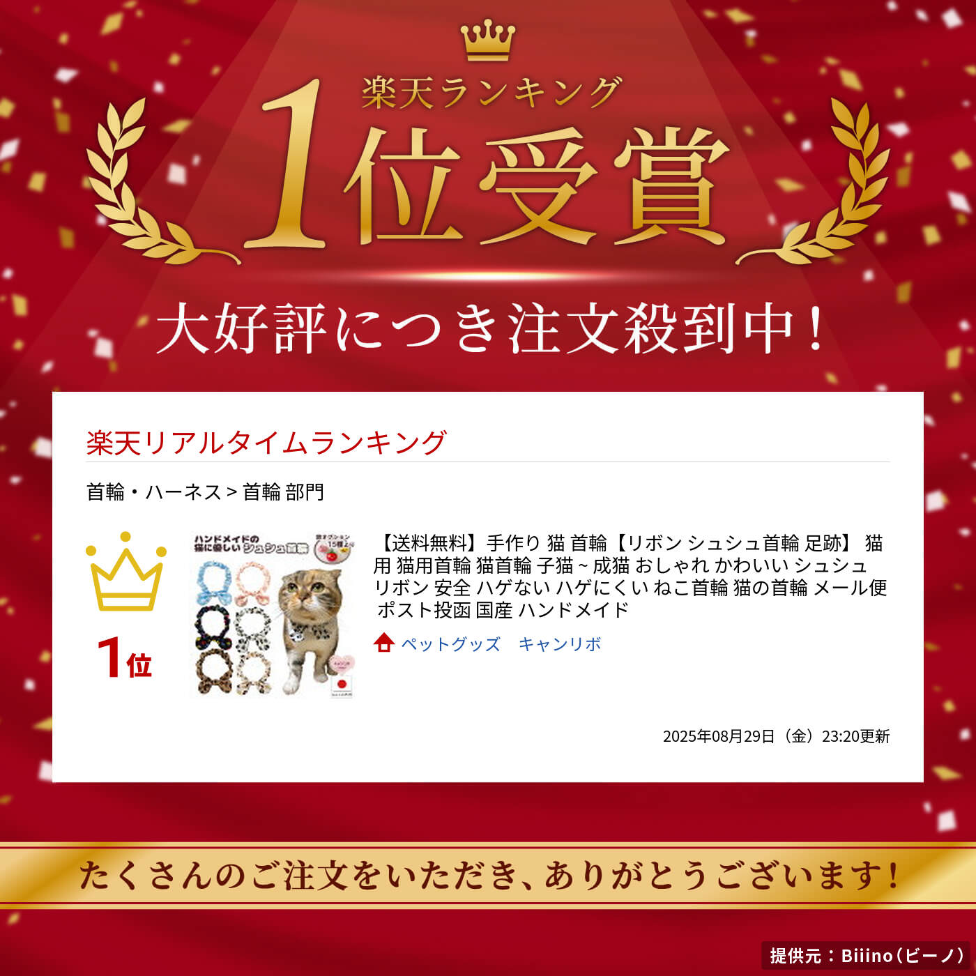 商品情報名称首に優しいシュシュ首輪 足跡サイズS:内周約20-21cm(目安:細め・小さめの猫) MS:内周約22-23cm(目安:成猫) M:内周約24-25cm(目安:成猫) LM:内周約27-28cm(目安:大きめ猫) L:内周約29-30cm(目安:ふっくらさん) 素材綿、ポリエステルゴム【ご注意下さい】・当商品は布製品でゴムが入っている為、表記サイズと実際の商品サイズに若干の誤差が生じる場合が御座います。また弊社では可能な限り慎重に測定を行っておりますが、お客様の測定方法と異なる場合、誤差が生じることが御座います。ご理解お願い致します。・手業での製作の為、同じ商品でも多少の違いが出る場合が御座います。・サイズ表記は首輪のサイズとなります。実際の首周りよりも2~3cm、ゆったり付けたい場合は3ー6cmほど大きい首輪をお選び下さい。※ただし毛の長さなども考慮してお選び下さい。・仔猫は皮膚が柔らかいため、生後6か月以上からのご使用をお願い致します。・飼い主様の管理下の元のご使用をお願いしております。締め付けず、引っかかっても伸びる仕様となっておりますが100%の安全を保証するものではありません。必ず飼い主様の管理下で安全にお使い頂きますようにお願い致します。モニター発色の具合により色合いが異なって見える場合がございます。うさぎ 小型犬 中型犬 大型犬 子猫 仔猫 子犬 仔犬 犬用首輪 ペット用首輪 和柄 シュシュ ストレス フリー チワワ 蝶ネクタイ アクセサリー 保護 日本製 国産 可愛い首輪 飼い猫 防災 災害 ハンドメイド 手作り カラー ペットカラー バンダナ ゴム入り 迷子札 名前入り 名入れ セミオーダー 小動物 セーフティ バックル セーフティ 日本製 国産 おすすめ クリックポスト【送料無料】猫 首輪【リボン シュシュ首輪 足跡】 猫用 猫用首輪 猫首輪 子猫 ~ 成猫 おしゃれ かわいい シュシュ リボン 安全 超軽量 選べる 鈴付き 動物 アニマル ねこ首輪 猫の首輪 メール便 ポスト投函 国産 ハンドメイド ★ハンドメイド国産★かわいい猫用リボン首輪 猫の首輪 犬首輪 いぬ首輪 ペット用品 ペットグッズ 【総販売数5万個越えの大人気商品です】 大人気の首に優しいシュシュ首輪です良質な生地を厳選し、軽くて柔らかいシュシュに仕上げているので首輪が苦手な子でも快適におしゃれをお楽しみに頂けます。伸縮性がありますので着脱がとっても簡単。お散歩など紐をつけてのご利用は不可となります。ご自宅にて飼い主様の管理下の元でのご着用をお願い致します。 丁寧に一つ一つ手づくり 首輪が苦手な子でも違和感を感じにくい 柄やカラーが豊富 首輪が苦手なペットでなかなか首輪が定着しない。 固い首輪ではなく、柔らかく軽い首輪を探している。 万が一の迷子に備えて飼い猫だと分かるようにしたい。 一部、受注製造の為、2−3営業日ほどお時間を頂いております。ご理解の程、お願い致します。 1