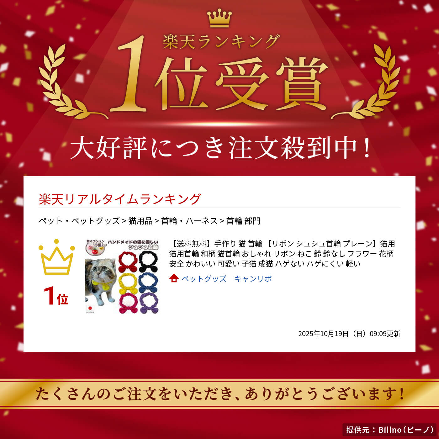 商品情報名称首に優しい シュシュ首輪 プレーンサイズS:内周約20-21cm(目安:細め・小さめの猫) MS:内周約22-23cm(目安:成猫) M:内周約24-25cm(目安:成猫) LM:内周約27-28cm(目安:大きめ猫) L:内周約29-30cm(目安:ふっくらさん)素材綿、高品質ポリエステル+ゴム【ご注意下さい】・当商品は布製品でゴムが入っている為、表記サイズと実際の商品サイズに若干の誤差が生じる場合が御座います。また弊社では可能な限り慎重に測定を行っておりますが、お客様の測定方法と異なる場合、誤差が生じることが御座います。ご理解お願い致します。・手業での製作の為、同じ商品でも多少の違いが出る場合が御座います。・サイズ表記は首輪のサイズとなります。実際の首周りよりも2~3cm、ゆったり付けたい場合は3ー6cmほど大きい首輪をお選び下さい。※ただし毛の長さなども考慮してお選び下さい。・仔猫は皮膚が柔らかいため、生後6か月以上からのご使用をお願い致します。・飼い主様の管理下の元のご使用をお願いしております。締め付けず、引っかかっても伸びる仕様となっておりますが100%の安全を保証するものではありません。必ず飼い主様の管理下で安全にお使い頂きますようにお願い致します。モニター発色の具合により色合いが異なって見える場合がございます。うさぎ 小型犬 中型犬 大型犬 子猫 仔猫 子犬 仔犬 犬用首輪 ペット用首輪 和柄 シュシュ ストレス フリー チワワ 蝶ネクタイ アクセサリー 保護 日本製 国産 可愛い首輪 飼い猫 防災 災害 ハンドメイド 手作り カラー ペットカラー バンダナ ゴム入り 迷子札 名前入り 名入れ セミオーダー 小動物 セーフティ バックル セーフティ 日本製 国産 おすすめ クリックポスト【送料無料】猫 首輪 【リボン シュシュ首輪 プレーン】猫用 猫用首輪 和柄 猫首輪 おしゃれ リボン ねこ 鈴 鈴なし フラワー 花柄 安全 かわいい 可愛い 子猫 成猫 子犬 小型犬 中型犬 アクセサリー 軽い 軽くてお洒落。シュシュ首輪なので伸びて安全です。可愛い首輪 ねこ首輪 蝶ネクタイ ハンドメイド 手作り カラー 【総販売数2万個越えの大人気商品です】 大人気の首に優しいシュシュ首輪です良質な生地を厳選し、軽くて柔らかいシュシュに仕上げているので首輪が苦手な子でも快適におしゃれをお楽しみに頂けます。伸縮性がありますので着脱がとっても簡単。サイズは実際の首周りよりも余裕を持ってお選び頂くことで快適にご利用頂けます。お散歩など紐をつけてのご利用は不可となります。ご自宅にて飼い主様の管理下の元でのご着用をお願い致します。 丁寧に一つ一つ手づくり 首輪が苦手な子でも違和感を感じにくい 柄やカラーが豊富 首輪が苦手なペットでなかなか首輪が定着しない。 固い首輪ではなく、柔らかく軽い首輪を探している。 万が一の迷子に備えて飼い猫だと分かるようにしたい。 一部、受注製造の為、2−3営業日ほどお時間を頂いております。ご理解の程、お願い致します。 1