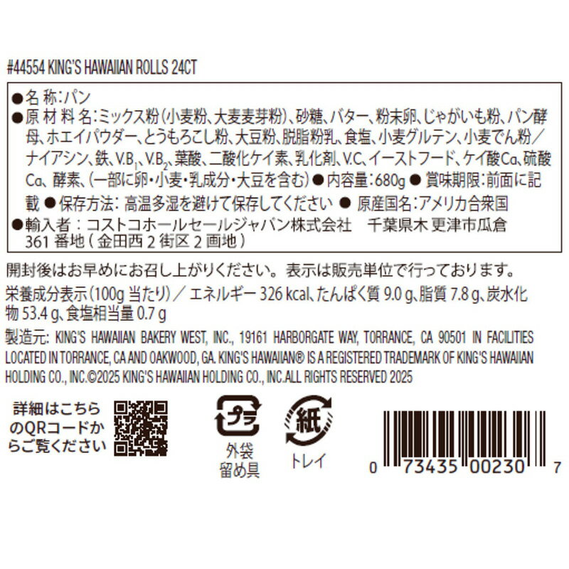 キングスハワイアン ハワイアンスイートロール 名称ハワイアンロール 内容量24個 680g/32個 907g 原産国アメリカ お召し上がり方 パッケージからパンのトレイを取り出し、150℃に予熱したオーブンでトレーごとパンを温めます。 2~3分温めればおいしく召し上がりいただけます。 商品の詳細 キングス ハワイアン ディナー ロールは、口の中とろけるような食感で、柔らかくふわふわで、ほどよい甘さが特徴です。 キングス ハワイアン ロールは、素晴らしいスライダー、お子様向けのスナック、デザートに最適なサイズで、どんなものでもお食事の省略役としてもお使いいただけます。 これらのたまらなくおいしいロールパンがテーブルに並ぶ前に食べられても止まらないでください。 商品の特徴 口の中でとろけるような食感で、ふんわりとやわらかく、ほどよい甘さがどんなお食事とも好相性。 高果糖コーンシロップ、人工着色料、トランス脂肪酸を不使用 ミニバーガーやお子様向けのスナック、デザートを作るのにぴったりなサイズ