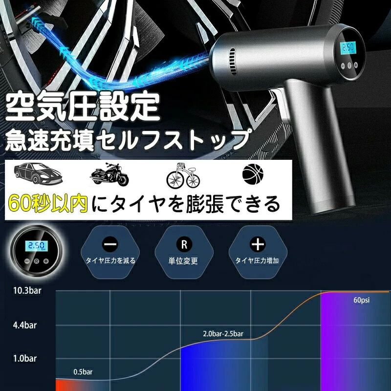 商品情報 重量:460G 電圧:7.4V/DC12V パワー:120W サイズ:160*60*85mm 【ご注意】 自転車の場合:【トンボ口金】付き、仏式、英式、美式対応可 【空気圧調整、自動停止】 「SET」ボタンを押して、LCDデジタル表示します。 空気圧の単位はPSI/BAR/KPA/Kg/m2の4つが選択でき、最大圧力は「150PSI」です。 トラック、バス、SUV、MPVなどにタイヤの気圧を確認と空気を補樹でも可能です。 設定したタイヤ空気圧に達すると自動で停止します。 【LEDライト付き】 LEDライトで手元を明るく照らせ、安全にバルブの開け閉めや空気入れの時も便利です 街灯がない道や視界の悪い場所でのタイヤ交換など、思わぬトラブル時も安全に作業ができます。 【自動停止保護】 空気圧を指定できる機能を備えて、設定圧力値に達すると、エアポンプは自動的に停止し、安全で信頼性の高い使用を提供します。空気の入れすぎや入れ不足などのご心配もありません。付属のバルブコネクタを変更すれば、自転車、自動車、 バイク、浮き輪、ボールなどの空気入れに幅広く対応可能です。 【空気圧測定&メモリ機能】 メモリ機能がついていて、初めに胎圧の数値を設定した後、次の使用時には、胎圧の値を再設定する必要はありません。とても便利です。(注意:異なるタイプのタイヤに空気を入れる場合、胎圧の値を再設定する必要があります!)内蔵マノメトリック機能、タイヤバルブに接続すると、いつでも現時点でのタイヤ空気圧を確認できます。 【携帯性抜群な小型かつ軽量】 電動コンプレッサー 重さは470gのみ、軽量の携帯式空気ポンプです、操作も簡単、御持ち運びもすごく便利ので、力が弱い女性でも簡単に空気入れができます。御持ち運びもすごく便利です。本体を長時間使用しないでください。長時間運転する必要がある場合は、しばらく休止した後、また使い続ける。(モーターの損傷を避けるため) 【大容量バッテリー内蔵】 2000mAh大容量バッテリー電動空気入れは小型ながら最大空気圧力150PSIを実現しており、スピーディーな空気充填が可能です。USB充電なので、どこでも便利に充電することができます。無線操作で、外出しても簡単に空気入れます。しかも電源コードが絡む悩みも避けます。