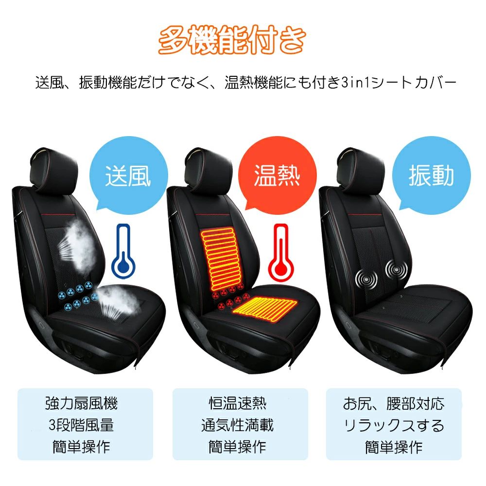 【商品の詳細】 *品名:車シートカバー *材質:PUレザー+メッシュ製素材 *機能:1.送風機能(8個強力ファン、3段階風量調節可)、2.振動機能(5つのモードが自動的に繰り返しマッサージする、15分後自動電源切れ)、3.温熱機能(30秒速熱し、55℃の温度で自動恒温する。) *電圧:DC12V *出力:24W *カラー:ブラック、ブラウン、ベージュ *給電:シガーソケット *使用:車用(12V対応可) *保証期間:半年 【製品の紹介】 *【送風・8つファンが内蔵されている】腰部やお尻の部分には強力ファンを8つ内蔵しており、高速回転でお尻と背中がひんやりして涼しくなり、長距離も汗をかかず快適です。涼しい運転環境作って蒸れずに快適になります *【3段階調節可能】風量は3段階調整可能、リモコンで便利的に切り替えます。ファン回転静音設計で静かに快適な運転時間を楽しめます。暑さと湿気を避けて暑い夏も快適に運転できます *【温熱機能付き】一般的なクーラーシートと違って、温熱機能にも搭載し30秒速熱し、55℃の温度で自動恒温する。お尻、背中の両部分が同時に加熱し、温感でぽかぽかし筋肉痛緩和、ストレス解消。夏だけでなく、冬でも楽々に使用できます *【振動機能付き】カーシートの腰部に振動モーターが2個内蔵されて、5つのモードが自動的に繰り返しマッサージする。運転者の腰にマッサージを行い、長距離ドライブのつかれをかいしょうする。タイマー機能が付き、15分後自動電源切れ *【通気性抜群&滑り止め加工】3D立体メッシュ製素材と高品質PUレザーを採用し、通気性が抜群、長時間座ってもお尻と背中が蒸れない。お手入れも簡単で、濡れた柔らかいタオルで拭いてください。裏面に滑り止め加工でクールシートのズレを防止してくれます。ゴムベルトとバックルで簡単装着、運転席や助手席にも取り付け自由 *【関連キーワード】マッサージ シート シートマッサージ カーシート クールカーシート クールシート シートクーラー ドライブシート 12v クールエアーカーシート ムレ防止 快適ドライブ 普通車 軽自動車 車載 エアークールシート エアークールクッション 長時間ドライブ 夏 ドライブ 暑い 運転 暑さ対策 グッズ 熱中症 対策 熱中症対策 熱中症対策グッズ おすすめ 家族 子ども 子供 大人 敷く トラック 長距離運転 省エネ PU メッシュ 通気性抜群