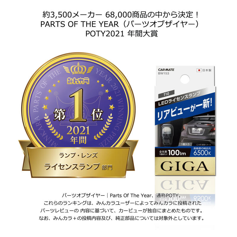 車 ナンバー灯 LED ライセンスランプ BW153 GIGA LED ライセンスバルブ R100T 6500K 100LM T10 全方向照射 1個入り 車検対応 安心 日本製 carmate (R80)