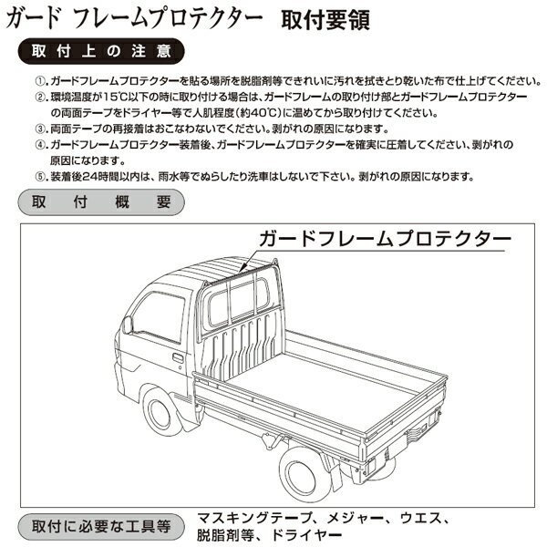 キズつきやすいガードフレームの保護に最適。材質:PVC(塩ビ)適用型式:S500P/S510P適用車両:ジャンボ・ハイルーフのみ幌類との同時装着不可。【取付後の点検】本体の両面テープ接着面に浮きがない事を確認してください。【お手入れについて】●汚れた場合はスポンジ等に中性洗剤を付けて水洗いしてください。●本体傷付の恐れがありますので自動洗車機の使用は極力避けてください。