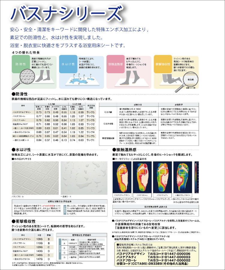 ★ご注意ください★ ★送料につきまして★ 北海道・沖縄・一部地域については別途送料がかかります。システム上、ご注文時の商品合計金額に、送料が表示されません。注文確定後、当店より正しい送料を追加し、ご案内致します。 ※目安:北海道・沖縄1梱包につき300円追加、離島は1000円〜2000円となります。 ★ご購入前に無料でサンプルもご用意致しております。 お問い合わせ画面より、「お名前」「ご住所」「お電話番号」「品番または商品名品名を記入ください。宅急便にて無料でお届け致します。 メーカー希望小売価格はメーカーカタログに基づいて掲載しています 商品詳細 キャスター走行性や接触温熱感に優れた浴室床シートです。機械浴室での使用におすすめです。 ※1m以上10cm単位での注文になります。1m10cmの場合、数量欄に【11】として入力してください。 ★ご注意下さい★ この商品はオーダー商品となります。ご注文確定後の変更に対応できません。 ※この商品には、意匠性として「石目柄」となります。無地ではございません。小さな白い点や灰色の点が模様としてございます。 こちらの商品はメーカー直送品となっております。他の商品との同梱はできません。 商品の特性上、お客様のご都合によります、ご注文後のキャンセル・変更・返品・交換は承っておりません。 返品・交換・キャンセルのできない商品です。開封した商品の返品・交換は一切お受けできません。 出荷後の住所・送付先の変更は転送料が必要となりますので、ご注文前にお届け先住所を必ずご確認ください。 カラー番号 BNA2101 BNA2102 BNA2103★施工に必要な専用接着剤バスナセメントEPO【単品】 と、接着剤や施工に必要な材料がセットされた便利なパックもございます。