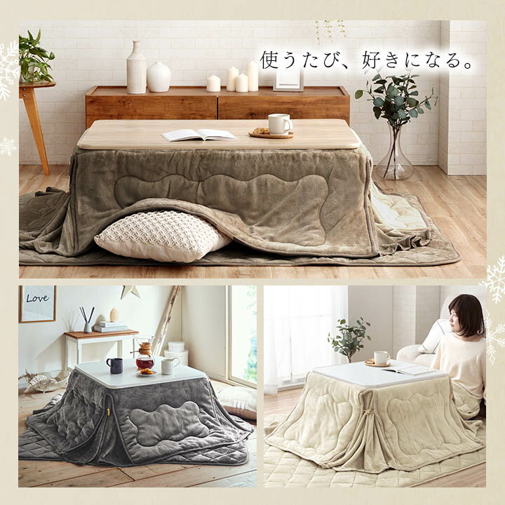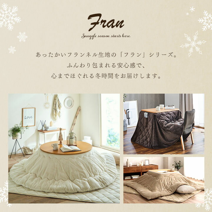 メーカー希望小売価格はメーカーカタログに基づいて掲載しています。セット内容 こたつ掛布団(省) こたつ台 サイズ展開 掛布団:約160×160cm (キルティング加工許容範囲 +5%〜3%) こたつ台:約60×60×38.5cm カラー:こたつ掛布団 モカ/グレー/ベージュ/アイボリー カラー:こたつ台 ホワイト/ブラック 組成:こたつ掛布団 【表地】 たれ部=ポリエステル100%(フランネル) 天板部=ポリエステル100%(フランネル) コーナー=ポリエステル100%(フランネル両面起毛) 【裏地】 ポリエステル100%(フランネル) 【中綿】 中空ポリエステル綿100%(抗菌防臭加工) 組成:こたつ台 【材質】 本体=(脚部)PP (ヒーター取付部)ABS 天板=(内部)パーティクルボード16mm (表面)低圧メラミン (エッジ)PVC 【ヒーター】 石英管ヒーター(400W) 電源スイッチ付きコード2.8m 温度ヒューズ、無段階温度調節機能 可変式サーモスタット内蔵原産国 中国 洗濯表示:こたつ掛布団 液温は40℃を限度とし、手洗いができる。(洗濯機は使用できません) 日陰のつり干しがよい。 商品説明 ■ 大人気のフランシリーズの省スペースこたつ2点セットです!! ■ 側地には柔らかく、肌触りの良いフランネル生地を使用してます。毛足が短いのでゴミや埃が絡みにくいという特長もあります。 ■ こたつ台は、気分によって使い分けるリバーシブル天板。 自然な木目調とシンプルな石目調のデザインです。 ■ 中間電源スイッチやコードフック等、あると便利な機能付き。 ※ こたつ敷き布団は別売りです。 ※ カラーによって、キルティングのデザインが異なります。 ※ 付属の取り扱い説明書を必ずお読みの上ご使用ください。 ※ こちらの電化製品につきまして、商品の特性上ご注文後の返品・交換はお受け致しかねます。あらかじめご了承ください。 ※ この製品は海外ではご使用になれません。変圧器をご使用いただいた場合でもご使用になれません。 ※ 本商品の天板は、生産時期の関係によりエッジ部分の形状が2タイプございます。お届けのタイプはお選びいただくことができません。あらかじめご了承ください。 ※ 掲載写真は表記サイズと異なる場合がございます。 ※ こたつ布団は生産時期により、同色の場合でも若干の色の差が生じることがございます。あらかじめご了承ください。 ※ 画面上のカラーはご使用ブラウザやモニターの設定により、実物とは若干異なる場合がございます。あらかじめご了承の上、ご注文をお願いいたします。 シリーズ展開 【掛け布団単品】 ■ フラン厚掛け掛布団単品 正方形(170×170cm/185×185cm/205×205cm) ■ フラン厚掛け掛布団単品 長方形(185×235cm/205×245cm/205×285cm/205×315cm) ■ フラン厚掛け掛布団単品 円形(185cm円形/205cm円形/225cm円形) ■ フラン厚掛け掛布団単品 185×225cm楕円形 【掛け布団+敷き布団 2点セット】 ■ フラン厚掛け 掛敷布団セット 170×170cm ■ フラン厚掛け 掛敷布団セット 185×185cm ■ フラン厚掛け 掛敷布団セット 185×235cm ■ フラン厚掛け 掛敷布団セット 205×205cm ■ フラン厚掛け 掛敷布団セット 205×245cm ■ フラン厚掛け 掛敷布団セット 205×285cm ■ フラン厚掛け 掛敷布団セット 205×315cm ■ フラン厚掛け 掛敷布団セット 185×225cm楕円形 ■ フラン厚掛け 掛敷布団セット 185cm円形 ■ フラン厚掛け 掛敷布団セット 205cm円形 ■ フラン厚掛け 掛敷布団セット 225cm円形 【掛け布団+こたつ台 2点セット】 ■ フラン厚掛け 掛台セット 170×170cm ■ フラン厚掛け 掛台セット 185×235cm ■ フラン厚掛け 掛台セット 205×245cm ■ フラン厚掛け 掛台セット 185×225cm楕円形 ■ フラン厚掛け 掛台セット 185cm円形 【省スペースタイプ】 ■ フラン省スペース掛け布団単品(160×160cm/160×190cm/175×175cm/180×220cm) ■ フラン省スペース掛け布団単品 大判サイズ(190×250cm/190×280cm) ■ フラン省スペース 掛敷布団セット ■ フラン省スペース 掛台2点セット 【ハイタイプ】 ■ フラン省スペースハイタイプ掛け布団単品(235×235cm/225×265cm/235×290cm) 【パーソナルタイプ】 ■ フランパーソナルこたつ掛け布団 ■ フランパーソナルこたつ3点セット 【キルトラグ】 ■ フランキルトラグ