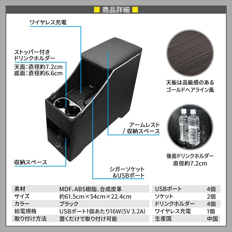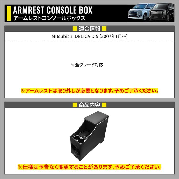 商品名 新型 三菱 デリカD:5 アームレスト コンソールボックス 適合車種 三菱 デリカD:5(MITSUBISHI DELICA D:5) 【年式:2019(平成31)年2月〜】 G-Power Package P G M ※全グレード対応 素材 レザー+木製 カラー ブラック パーツ数 本体×1 商品説明 ★車内での収納力アップ!便利アイテム! ★長時間の運転の疲れを軽減ように、センターコンソールの空きスペース有効活用のアームレストを設計しております。 ★表面に上質なレザー(合成合皮)を使用高級感のある質感の生地で、摩擦にも強くて、汚れがつきにく、しっかりした作りです。内側がソフトな上級素材で仕立てられてある程度で騒音を軽減できます。 またコンソール中にブルーLED付きで、車内を煌びやかに演出します。夜間の使用にも適しています。 ★上質を演出曲線で車内との統一感のあるデザイン!さらに車内の高級感をUP!!! ★運転席と助手席の間のスペースに置くだけで、より広く便利な収納スペース。アームレスト内のスペースを有効活用で収納率アップ!!! ★前席+後席にUSBポートを増設、これを使用すると、デジタルカメラ、PDA、携帯電話、USBアクセサリなど、あらゆるデバイスを充電できます。後部座席の乗客にも便利になります。 ★取付する時、加工せずそのまま取り付けが可能な専用設計デザイン。 取付方法 取付方法の画像をご参照ください。 保証 ■商品到着後3ヶ月保障■ ※保証期間を超えますと、如何なる場合でもご対応いたしかねます。予めご了承ください。 送料 ■送料無料■ ※離島他の扱い 北海道、沖縄、離島・一部地域は追加送料がかかる場合があります。 ご注文後、当店で送料を訂正した金額にてご注文承諾メールをお送りさせていただいておりますので、ご確認ください。 注意事項 ※こちらの商品は社外品となります。 ※海外輸入品ため、小さなキズや汚れなどある場合があります。予めご了承ください。使用に支障がない限り交換、返品はいたしません。 ※ご自身の車体グレードの取り付け部分と本商品を画像にてご確認の上で、お買い求めてください。 ※商品のイメージ違い、お客様の事前形状確認不足等の返金返品はお断りさせていただきます。予めご了承ください。