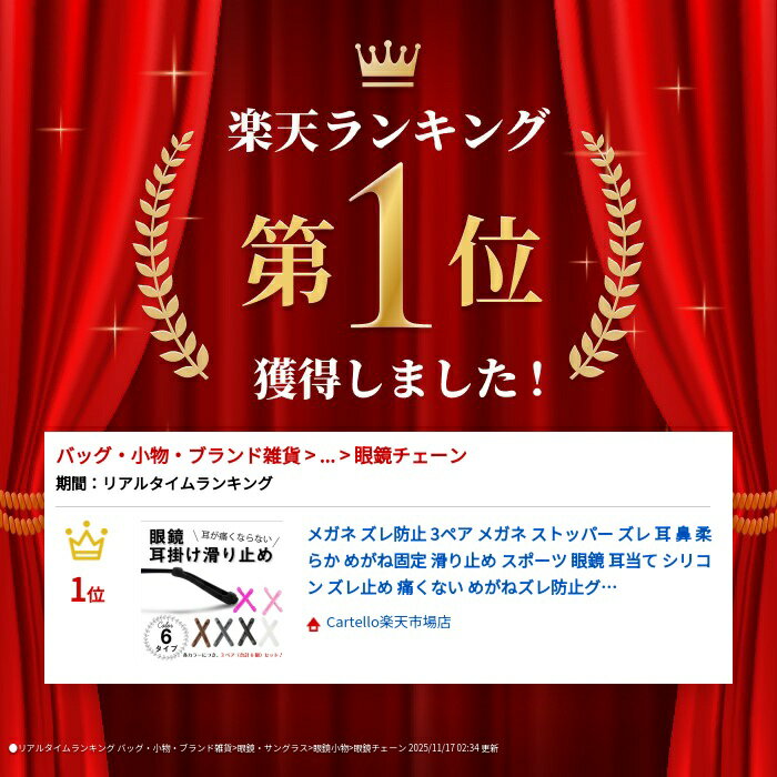 商品情報商品説明「めがねずれおちん」は、めがねのフレームに装着するだけでめがねのズレ落ちを防止する耳あてです。同色カラー3ペア(6本)での販売になります。眼鏡の柄の部分に取り付けるだけで簡単・メガネのツルに差し込んで、メガネをズレ落ちにくくします。・耳にかけても痛くないシリコン素材。・伸縮性に優れていて型崩れしない素材。・両端部分のみ筒状で簡単取り付け。・多少引っ張ったりしてもちぎれたりしません。・フレームが多少太いメガネでもご使用いただけます。・3〜10幅のフレームに対応しています。・4色展開でさまざまなカラーの眼鏡に対応。・シリコン製の柔らかい素材なので付け心地良く耳が痛くならない。サイズ/素材幅3mm〜10mmのフレームに装着できます。柔軟性のあるシリカゲル製カラーブラックグレーブラウンクリアその他、注意点等のご説明【発送や納期について】発送納期は商品選択画面(配送予定)よりご確認ください。原則1〜3営業日以内の発送となります。※予約商品の場合は発送までにお時間がかかりますので必ずご確認ください。【包装について】環境保護の観点から、「簡易包装」を推進しておりますのでご理解をお願いいたします。【明細書について】当店ではエコロジーと個人情報流出防止のため、明細書を発行しておりません。【注意点】お客様のご覧になられますパソコン機器及びモニタなどの違い、また室内、室外での撮影により実際の商品素材の色と相違する場合もありますのでご了承下さい。商品キーワードピタリング ズレ 落ちない ズレ防止 すれ スレ いたくない 簡単 装着 メガネ ズレ防止 防止 メガネ ズレ防止 3ペア 耳 鼻 柔らか めがね固定 滑り止め シリコン ズレ止め 痛くない めがねズレ防止グッズ めがねずれおちん ズレ落ち防止 耳が痛い 防止 メンズ レディース レディース レディースおしゃれ メンズ眼鏡チェーン眼鏡チェーン レディース メンズ パーツ レディースおしゃれ 子供 大人 赤ちゃん 大人女子 主婦 ママ OL 母 妻 義母 祖母 娘 姉 妹 女の子 おそろい お揃い シェア ペア カップル 夫婦 彼女 彼氏 友達 家族 お子様 子供用 親子 小学生 中学生 高校生 大学生 ビジネス 社会人 初売り まだ 間に合う 予約 できる メガネストッパー メガネ ずれ防止 ずれ落ち防止 眼鏡 すべり止め ウォーキング スキー 運動 防止 帽子 サングラス ランニング 落下 ストッパー ズレ防止 メガネ固定 スポーツ 福袋 野球イベント、関連キーワード1月 2月 3月 4月 5月 6月 7月 8月 9月 10月 11月 12月 ゲリラ アウトレット お一人様1点限り 買い回りマラソン お買い物マラソン お買い物マラソン予定 スケジュール ブラックフライデー ブラック フライデー 2023 年 BLACK FRIDAY BLACKFRIDAY blackfriday black friday 楽天ブラックフライデー 母の日 父の日 こどもの日 子供の日 子どもの日 スーパー 大感謝祭 楽天大感謝祭 4時間限定 年末大感謝祭 年末★超大感謝祭 年末特別企画 年末 年末年始 初売り プレゼント クリスマスプレゼント クリスマス 買い物マラソン おかいものマラソン お買物マラソン タイム マラソンクーポン クーポンあり★お買い物マラソン 楽天お買い物マラソン 大感謝祭 大感謝祭り 大感謝祭限定 マラソン限定 マラソン限定 マラソン 楽天お買い物マラソン 大感謝祭 大感謝祭り 大感謝祭限定 1時間限定 4時間 クリスマスプレゼント クリスマス らくてん Xmas 販売開始前 楽天 2月 ポイント 上限 販売期間前 対象商品 超目玉 目玉商品 早い者勝ち 2時間限定 子供服保育園 子供会 友達 孫 送料無料 お買い物マラソンとは? マラソンクーポン クーポンあり★お買い物マラソン お買い物マラソン 楽天お買い物マラソン マラソン限定 マラソン限定 楽天お買い物マラソン 1時間限定 4時間 クリスマスプレゼント クリスマス Xmas 販売開始前 楽天 ポイント 上限 販売期間前 スーパー 対象商品 超目玉 タイム 早い者勝ち 在庫処分 4時間限定 誕生日 クリスマス 入園祝い 入学祝い 卒園祝い 卒業祝い 就職祝い 入社祝い 合格祈願 合格祝い 結婚祝い 結婚記念日 入籍記念日 妊娠祝い 出産祝い お見舞い 退院祝い 成人祝い 還暦祝い 内祝い 引っ越し祝い 新築祝い 開店祝い 改装祝い 移転祝い 昇進祝い 定年祝い 退職祝い 転職祝い 転勤祝い 母の日 父の日 敬老の日 カップル記念日 バレンタインデー ホワイトデー お正月 成人の日 成人式 ご挨拶 お年賀 バレンタイン 本命 義理 節分ホワイトデー お返し ひな祭り 卒業式 入学式 入園式 就職祝い 卒業祝い お花見 母の日 女性 カーネーション 歓迎会 父の日 男性 梅雨 七夕 お中元 ひまわり お盆休み お盆玉 暑中見舞い 残暑見舞い 夏休み 敬老の日 お彼岸 ハロウィン 発表会 夫婦の日 展示会 七五三 クリスマス お歳暮 プレゼント ギフト トレンド 人気 ランキング 送料無料 おそろい お揃い シェア ペア カップル 帰省 日帰り対象者あかちゃん 赤ちゃん 幼児 子供 子供用 お子様 こども きっず キッズ 男子 女子 女の子 男の子 友人 ユニセック