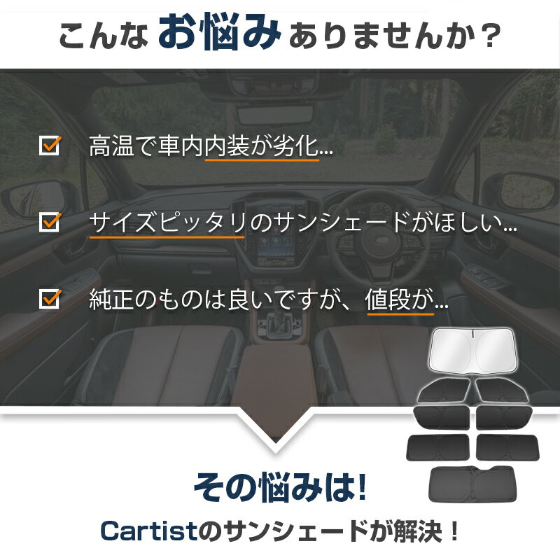 ハイエース 200系 サンシェード 商品説明 POINT1:ハイエース 200系専用設計で、車体の窓に隙間なくフィット!太陽光をしっかり遮断します。更に、外からの視線もシャットアウトするので、車中泊や着替えなどのプライバシーにも保護できます! POINT2:車全体をカバーできるサンシェード!日差しをカットし、車内にこもりがちな熱を防いでくれます。 POINT3:夏は強い日差しや紫外線を遮断し、車内や肌の日焼け、ダッシュボード、ハンドルなどの劣化を防ぎ、紫外線から車内のインテリアを守ります。 POINT4:CADデータによる超高精度のカッティング技術により、各メーカー車種別の窓形に対応し、全ての車種にジャストフィット設計! POINT5:外からの視線をシャットアウトするので、しっかりプライバシーを確保できるだけでなく、車外の様子をのぞいたい時や換気したい場合にサンシェード全体を取り外さず折りたためるだけでOK! POINT6:ワイヤー式で、フレームには弾力性のある形状記憶合金を使用しているため、吸盤を使わずに窓の枠にはめ込むだけで、手間なく簡単に装着可能です。 商品仕様 適合車種:トヨタ ハイエースバン 200系 2004年08月~ 素材:ポリウレタン断熱材 カラー:フロント(表側シルバー/裏側ブラック)、サイド/リア(両面ブラック) セット内容:サンシェード×8枚、収納カバー×1、フック×1式 ※ドライブレコーダーが装着する場合、取り付けは可能ですが、ガラスとの間に隙間が出て来ますので、ご了承下さい。 ※お車の形状をご確認いただいた上、お買い求めください。 注意事項 ※お使いのモニターの発色具合によって、実際のものと色が異なる場合がございます。