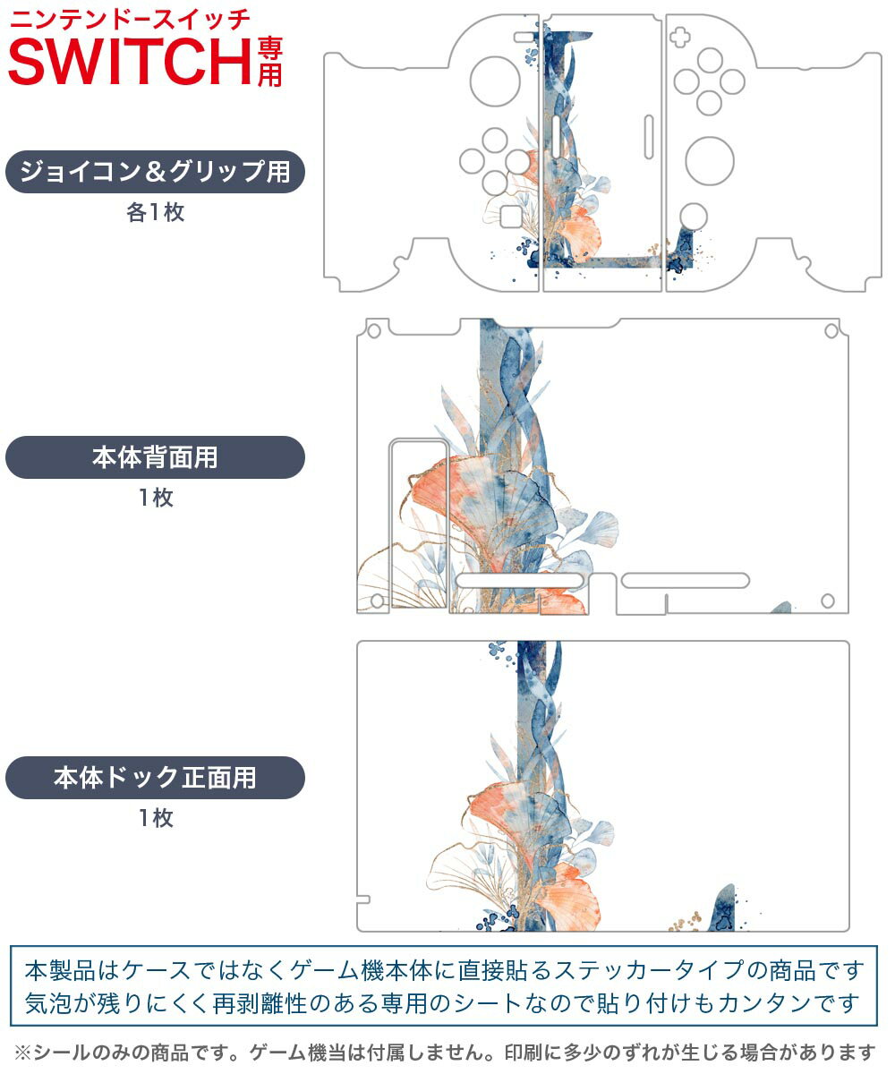 製品名 Nintendo Switch 本体裏面&ドック正面&ジョイコン専用 デザインスキンシール セット内容 Nintendo Switch 本体&ドック&ジョイコン用スキンシール(各1枚) ニンテンドースイッチ専用です。携帯機のSwitch LiteやProコンには対応していません。 商品特徴 再剥離性シートを素材に採用し、細かな位置調整がしやすく貼り直しが容易です。専用の業務プリンターを使い、商品画像と遜色のない美しい印刷仕上がり。 注意事項 画像はサンプルですので、ご覧の環境によっては多少色味に違いを感じる場合がございます。 イメージと違った、モニターと色味が異なるという理由での交換や返金はご対応出来かねます。スキンシールのみの販売で、ニンテンドースイッチ本体などは付属しません。シワができた場合、ドライヤーなどで軽く温め、外側に向けてシワを伸ばすように貼ってください。初回貼付時の位置調整や貼り直しは可能ですが、しっかりと押し付けて接着させた後の再剥離、再利用は保証しておりません。また接着部に油分や汚れが付着しますと角の部分は剥がれやすくなりますので、貼付時はあまり触れないようにご注意ください。無地のセミグロスシートにデザインをプリントした商品で、デコなどの加工はございません。 凹凸や光沢があるように見えたり布地や金属を素材にしたように見える商品もありますが、デザインの図版によるものです。印刷時に微妙な画像のズレが生じる場合がございます。ご注文後に1点1点制作する受注生産品の為、不良品以外のご返品や交換は固くお断りします。当店における繰り返しの実機テストでは問題ありませんでしたが、経過年数や使用環境により、シールを剥がす際に本体の塗装が一部剥がれる可能性があります。恐れ入りますが、万が一そのような状況になった場合でも当店ではゲーム機本体の保証は出来かねますので、予めご理解の上お求めください。 商品発送 完全受注生産のハンドメイド商品となりますので、既製品と比べて発送までお時間を頂いています。 基本的に決済確認後2?3営業日、最大で10営業日での発送となります。繁忙期や休業日明けの場合はさらに時間がかかる場合があります。 その際には別途メールにてご連絡致します。メール便の場合、発送日から到着までに2?4日ほどかかる場合が多く、紛失などの保障もご対応できかねます。あらかじめご了承下さい。