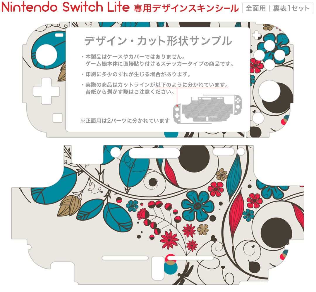 製品名 Nintendo Switch Lite専用 デザインスキンシール セット内容 Nintendo Switch Lite本体用スキンシール(裏表)各1枚 ※液晶側シールは2パーツに分かれていますニンテンドースイッチライト専用です。据え置き機のSwitch本体やJoyコンには対応していません。 商品特徴 3M社製の再剥離性シートを素材に採用し、細かな位置調整がしやすく貼り直しが容易です。また、エアフリーでもありますので気泡が簡単に逃げるので、キレイに貼ることができます。専用の業務プリンターを使い、商品画像と遜色のない美しい印刷仕上がり。 注意事項 画像はサンプルですので、ご覧の環境によっては多少色味に違いを感じる場合がございます。 イメージと違った、モニターと色味が異なるという理由での交換や返金はご対応出来かねます。スキンシールのみの販売で、ニンテンドースイッチ本体などは付属しません。シワができた場合、ドライヤーなどで軽く温め、外側に向けてシワを伸ばすように貼ってください。初回貼付時の位置調整や貼り直しは可能ですが、しっかりと押し付けて接着させた後の再剥離、再利用は保証しておりません。また接着部に油分や汚れが付着しますと角の部分は剥がれやすくなりますので、貼付時はあまり触れないようにご注意ください。無地のセミグロスシートにデザインをプリントした商品で、デコなどの加工はございません。 凹凸や光沢があるように見えたり布地や金属を素材にしたように見える商品もありますが、デザインの図版によるものです。印刷時に微妙な画像のズレが生じる場合がございます。ご注文後に1点1点制作する受注生産品の為、不良品以外のご返品や交換は固くお断りします。 商品発送 完全受注生産のハンドメイド商品となりますので、既製品と比べて発送までお時間を頂いています。 基本的に決済確認後2?3営業日、最大で10営業日での発送となります。繁忙期や休業日明けの場合はさらに時間がかかる場合があります。 その際には別途メールにてご連絡致します。メール便の場合、発送日から到着までに2?4日ほどかかる場合が多く、紛失などの保障もご対応できかねます。あらかじめご了承下さい。