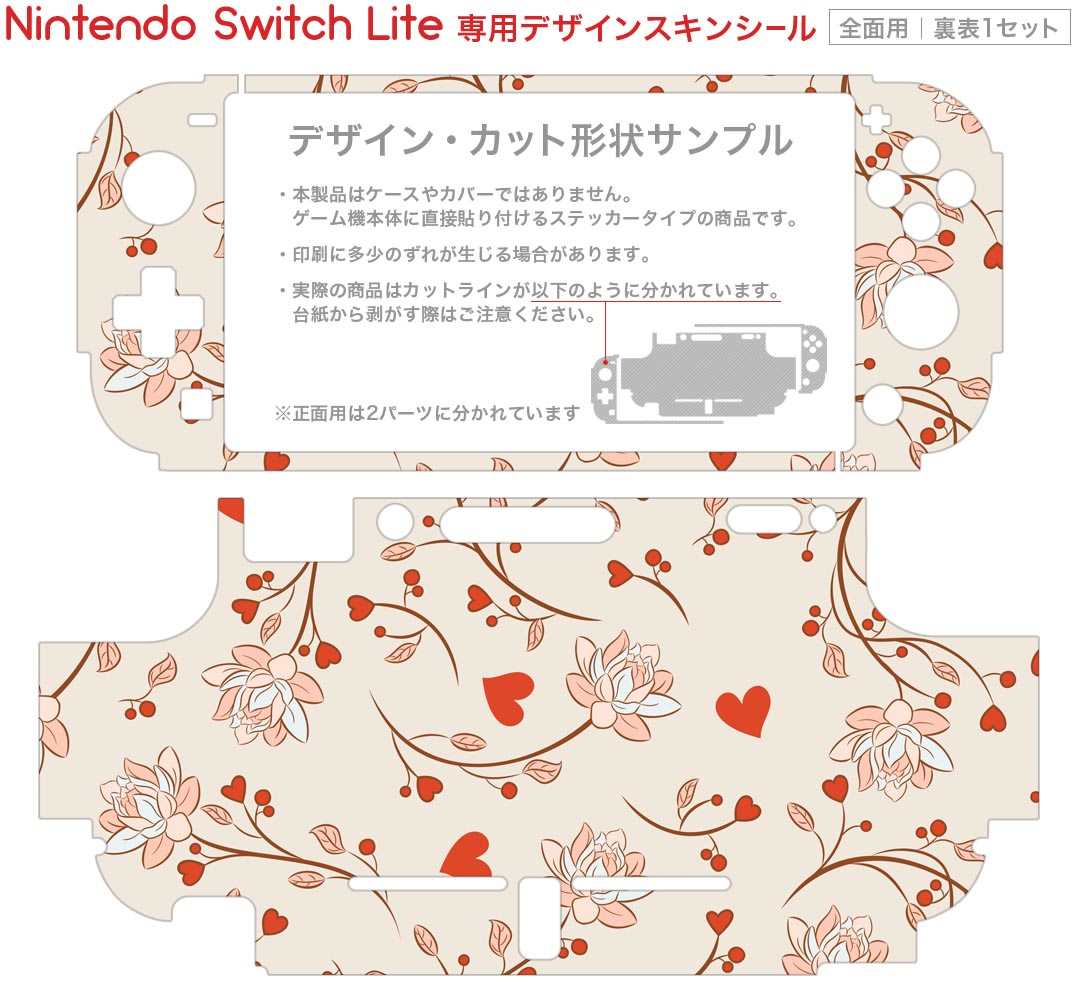 製品名 Nintendo Switch Lite専用 デザインスキンシール セット内容 Nintendo Switch Lite本体用スキンシール(裏表)各1枚 ※液晶側シールは2パーツに分かれていますニンテンドースイッチライト専用です。据え置き機のSwitch本体やJoyコンには対応していません。 商品特徴 3M社製の再剥離性シートを素材に採用し、細かな位置調整がしやすく貼り直しが容易です。また、エアフリーでもありますので気泡が簡単に逃げるので、キレイに貼ることができます。専用の業務プリンターを使い、商品画像と遜色のない美しい印刷仕上がり。 注意事項 画像はサンプルですので、ご覧の環境によっては多少色味に違いを感じる場合がございます。 イメージと違った、モニターと色味が異なるという理由での交換や返金はご対応出来かねます。スキンシールのみの販売で、ニンテンドースイッチ本体などは付属しません。シワができた場合、ドライヤーなどで軽く温め、外側に向けてシワを伸ばすように貼ってください。初回貼付時の位置調整や貼り直しは可能ですが、しっかりと押し付けて接着させた後の再剥離、再利用は保証しておりません。また接着部に油分や汚れが付着しますと角の部分は剥がれやすくなりますので、貼付時はあまり触れないようにご注意ください。無地のセミグロスシートにデザインをプリントした商品で、デコなどの加工はございません。 凹凸や光沢があるように見えたり布地や金属を素材にしたように見える商品もありますが、デザインの図版によるものです。印刷時に微妙な画像のズレが生じる場合がございます。ご注文後に1点1点制作する受注生産品の為、不良品以外のご返品や交換は固くお断りします。 商品発送 完全受注生産のハンドメイド商品となりますので、既製品と比べて発送までお時間を頂いています。 基本的に決済確認後2?3営業日、最大で10営業日での発送となります。繁忙期や休業日明けの場合はさらに時間がかかる場合があります。 その際には別途メールにてご連絡致します。メール便の場合、発送日から到着までに2?4日ほどかかる場合が多く、紛失などの保障もご対応できかねます。あらかじめご了承下さい。