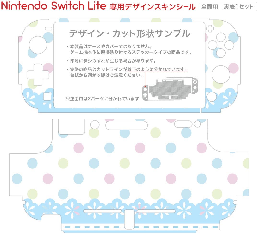 製品名 Nintendo Switch Lite専用 デザインスキンシール セット内容 Nintendo Switch Lite本体用スキンシール(裏表)各1枚 ※液晶側シールは2パーツに分かれていますニンテンドースイッチライト専用です。据え置き機のSwitch本体やJoyコンには対応していません。 商品特徴 3M社製の再剥離性シートを素材に採用し、細かな位置調整がしやすく貼り直しが容易です。また、エアフリーでもありますので気泡が簡単に逃げるので、キレイに貼ることができます。専用の業務プリンターを使い、商品画像と遜色のない美しい印刷仕上がり。 注意事項 画像はサンプルですので、ご覧の環境によっては多少色味に違いを感じる場合がございます。 イメージと違った、モニターと色味が異なるという理由での交換や返金はご対応出来かねます。スキンシールのみの販売で、ニンテンドースイッチ本体などは付属しません。シワができた場合、ドライヤーなどで軽く温め、外側に向けてシワを伸ばすように貼ってください。初回貼付時の位置調整や貼り直しは可能ですが、しっかりと押し付けて接着させた後の再剥離、再利用は保証しておりません。また接着部に油分や汚れが付着しますと角の部分は剥がれやすくなりますので、貼付時はあまり触れないようにご注意ください。無地のセミグロスシートにデザインをプリントした商品で、デコなどの加工はございません。 凹凸や光沢があるように見えたり布地や金属を素材にしたように見える商品もありますが、デザインの図版によるものです。印刷時に微妙な画像のズレが生じる場合がございます。ご注文後に1点1点制作する受注生産品の為、不良品以外のご返品や交換は固くお断りします。 商品発送 完全受注生産のハンドメイド商品となりますので、既製品と比べて発送までお時間を頂いています。 基本的に決済確認後2?3営業日、最大で10営業日での発送となります。繁忙期や休業日明けの場合はさらに時間がかかる場合があります。 その際には別途メールにてご連絡致します。メール便の場合、発送日から到着までに2?4日ほどかかる場合が多く、紛失などの保障もご対応できかねます。あらかじめご了承下さい。