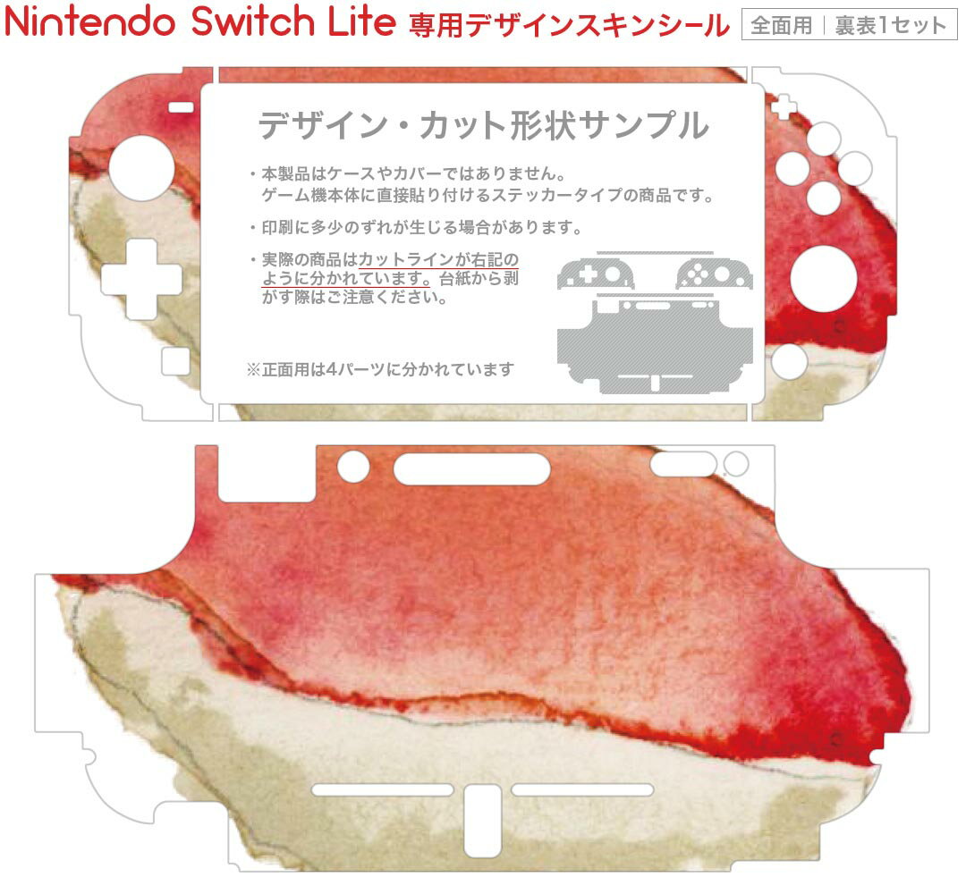 製品名 Nintendo Switch Lite専用 デザインスキンシール セット内容 Nintendo Switch Lite本体用スキンシール(裏表)各1枚 ※液晶側シールは2パーツに分かれていますニンテンドースイッチライト専用です。据え置き機のSwitch本体やJoyコンには対応していません。 商品特徴 3M社製の再剥離性シートを素材に採用し、細かな位置調整がしやすく貼り直しが容易です。また、エアフリーでもありますので気泡が簡単に逃げるので、キレイに貼ることができます。専用の業務プリンターを使い、商品画像と遜色のない美しい印刷仕上がり。 注意事項 画像はサンプルですので、ご覧の環境によっては多少色味に違いを感じる場合がございます。 イメージと違った、モニターと色味が異なるという理由での交換や返金はご対応出来かねます。スキンシールのみの販売で、ニンテンドースイッチ本体などは付属しません。シワができた場合、ドライヤーなどで軽く温め、外側に向けてシワを伸ばすように貼ってください。初回貼付時の位置調整や貼り直しは可能ですが、しっかりと押し付けて接着させた後の再剥離、再利用は保証しておりません。また接着部に油分や汚れが付着しますと角の部分は剥がれやすくなりますので、貼付時はあまり触れないようにご注意ください。無地のセミグロスシートにデザインをプリントした商品で、デコなどの加工はございません。 凹凸や光沢があるように見えたり布地や金属を素材にしたように見える商品もありますが、デザインの図版によるものです。印刷時に微妙な画像のズレが生じる場合がございます。ご注文後に1点1点制作する受注生産品の為、不良品以外のご返品や交換は固くお断りします。 商品発送 完全受注生産のハンドメイド商品となりますので、既製品と比べて発送までお時間を頂いています。 基本的に決済確認後2?3営業日、最大で10営業日での発送となります。繁忙期や休業日明けの場合はさらに時間がかかる場合があります。 その際には別途メールにてご連絡致します。メール便の場合、発送日から到着までに2?4日ほどかかる場合が多く、紛失などの保障もご対応できかねます。あらかじめご了承下さい。