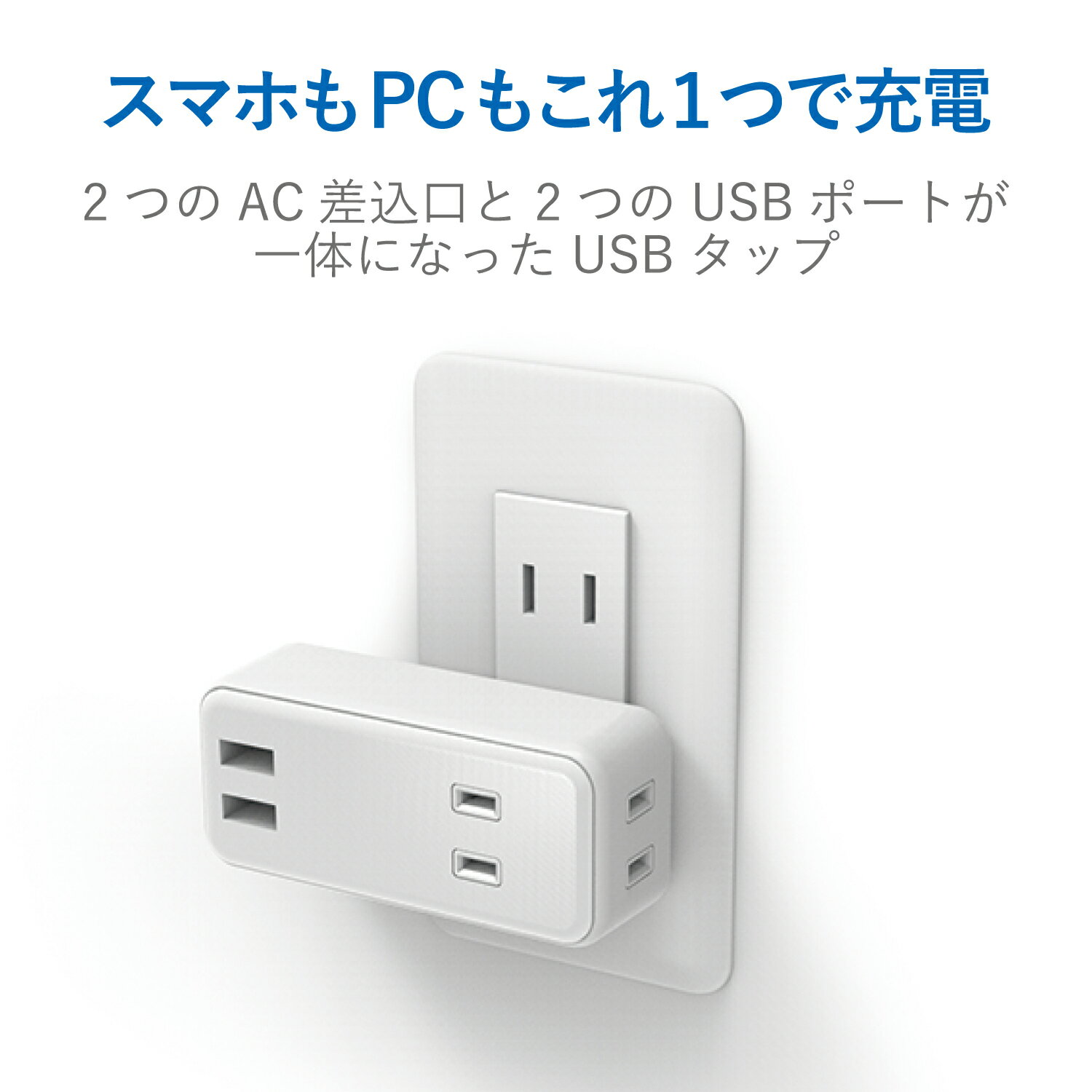 【商品説明】■2つのAC差込口と2つのUSBポートが一体になったモバイルUSBタップです。■パソコンやスマートフォン、タブレットを同時に充電可能です。■コンセントにそのまま接続する直差しタイプで、コンセントの口を塞がない横差しタイプです。■AC差込口には、未使用時にほこりの侵入を防止する「ほこり防止シャッター」を装備しています。■AC差込口には、万一の発熱の際にも融解しにくく、電気火災の防止に有効な耐熱性に優れたユリア樹脂を使用しています。■ACプラグの根本に絶縁キャップがついており、トラッキング現象による火災の防止に役立ちます。■2ピン式の電源プラグを採用しています。■USBポートを2ポート搭載しており、スマートフォンなどを2台同時に充電可能です。2ポート合計最大2.4Aの出力が可能です。■USBポートに搭載した高性能ICが接続機器を自動で見分けて最適な出力で最速に充電できる“おまかせ充電”に対応しています。■USB充電部に10年使える長寿命設計を実現しています。※あくまでも電気設計上の寿命であり、製品の寿命を保証するものではありません。■※充電に必要な各種ケーブルは同梱していません。別途お買い求めの上、ご使用下さい。【仕様】■対応機種:iPhoneおよびUSB端子で充電するスマートフォン■コネクタ形状:USB Aメス×2■定格入力電圧:AC100V 50/60Hz ■定格出力電圧:AC 100V / DC 5V■定格出力電流:合計最大2.4A(1ポート最大2.4A)■保証期間:1年間■本体差込口形状:2ピン■本体差込口個数:2個口■プラグ仕様:2ピン・固定式プラグ■定格:USB側:5V/合計最大2.4A(1ポート最大2.4A) AC側:125V 15A 1500W■ほこりシャッター:○■絶縁キャップ付きプラグ:○■カラー:ホワイト■材質:本体:ABS樹脂、差込口:ユリア樹脂■外形寸法:幅40mm×奥行90mm×高さ31mm■質量:約80g■使用可能地域:本製品は日本国内の電源を想定して設計されていますので、日本国外ではご使用いただけません。■電気用品安全法:PSE適合【発送予定について】表記の発送予定はあくまで目安です。メーカーの在庫状況によっては、さらにお時間をいただく場合がございます。
