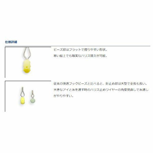 入り数:36個 ※掲載している商品の画像は代表画像を表示しています。また実物と色が違って見える場合があります。あらかじめご了承下さい。カワハギ仕掛けなどで重宝する従来の快適フックビーズにデカシリーズよりも、ビーズ部、ハリス止め部がデカい『快適フックビーズ デカ』。寒い冬場での利用を考慮し、ビーズ部はフラット型仕様。船の上でもハリス替えが簡単に出来る。ハリス止め部は真鍮製ワイヤーを使用し、先端に微妙な隙間を設ける事により糸つぶれがしにくく、ハリスを固定する事が可能。ハリスを通す時にハリス止め部のワイヤー角度を見直すことにより、糸が入りやすくなっているのが特徴。