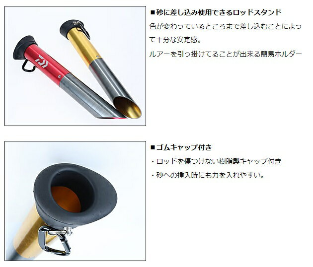 砂浜に差し込み固定できるロッドスタンド。対応ロッド径33mmまで。11Ftまでの使用を想定したロング設計。竿のバッドを傷つけにくいゴムキャップ付き。携帯に便利なカラビナ付き全長:300m 重量:160g ※実物と色が違って見える場合があります。あらかじめご了承下さい。